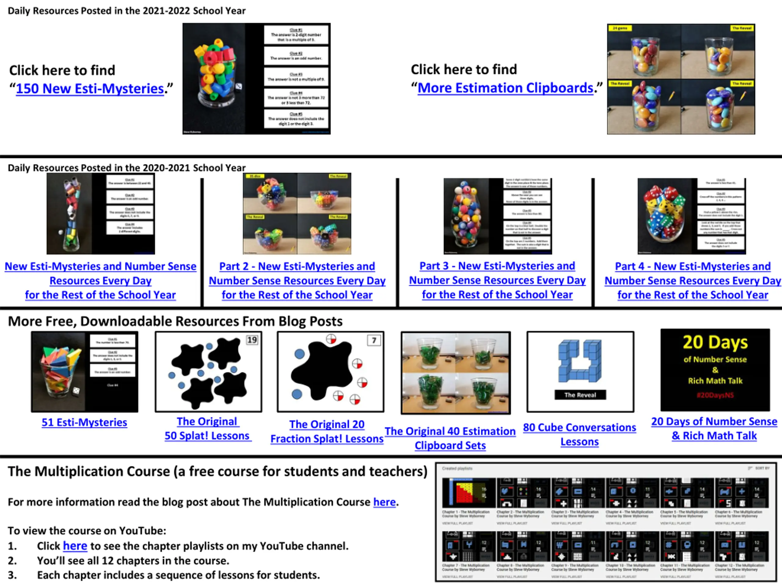 Daily Resources Posted in the 2021-2022 School Year Click here to find More Estimation Clipboards. Click here to find 150 New Esti-Mysteries. Daily Resources Posted in the 2020-2021 School Year C:\Users\Steve Wyborney\Desktop\STEVES Esti-Mystery Clue Toolkit and Templates FALL 2020.jpg C:\Users\Steve Wyborney\Desktop\Blog Post Pics and email too\Clipboard Dice.jpg C:\Users\Steve Wyborney\Desktop\Blog Post Pics and email too\Part 3 Feature Pic.jpg C:\Users\Steve Wyborney\Desktop\Part 4 Featured Pic.jpg Part 3 - New Esti-Mysteries and Number Sense Resources Every Day for the Rest of the School Year New Esti-Mysteries and Number Sense Resources Every Day for the Rest of the School Year Part 2 - New Esti-Mysteries and Number Sense Resources Every Day for the Rest of the School Year Part 4 - New Esti-Mysteries and Number Sense Resources Every Day for the Rest of the School Year More Free, Downloadable Resources From Blog Posts C:\Users\Steve Wyborney\Desktop\20 Days Title Pic.jpg C:\Users\Steve Wyborney\Desktop\SPLAT blog post folder\Splat Promo Images and GIFs\Splat Level 3 B.jpg C:\Users\Steve Wyborney\Desktop\Splat Promos HUGE SET\Slide6.JPG C:\Users\Steve Wyborney\Desktop\Presentation1.jpg C:\Users\Steve Wyborney\Desktop\8.8.2018 Desktop\Estimation Clipboard Desktop Materials\Bundle 1 Glasses Pic.jpg 20 Days of Number Sense Rich Math Talk 51 Esti-Mysteries The Original 50 Splat! Lessons 20 Days of Number Sense & Rich Math Talk 51 Esti-Mysteries The Original 20 Fraction Splat! Lessons 80 Cube Conversations Lessons The Original 40 Estimation Clipboard Sets The Multiplication Course (a free course for students and teachers) For more information read the blog post about The Multiplication Course here. To view the course on YouTube: 1. Click here to see the chapter playlists on my YouTube channel. 2. You ll see all 12 chapters in the course. 3. Each chapter includes a sequence of lessons for students.