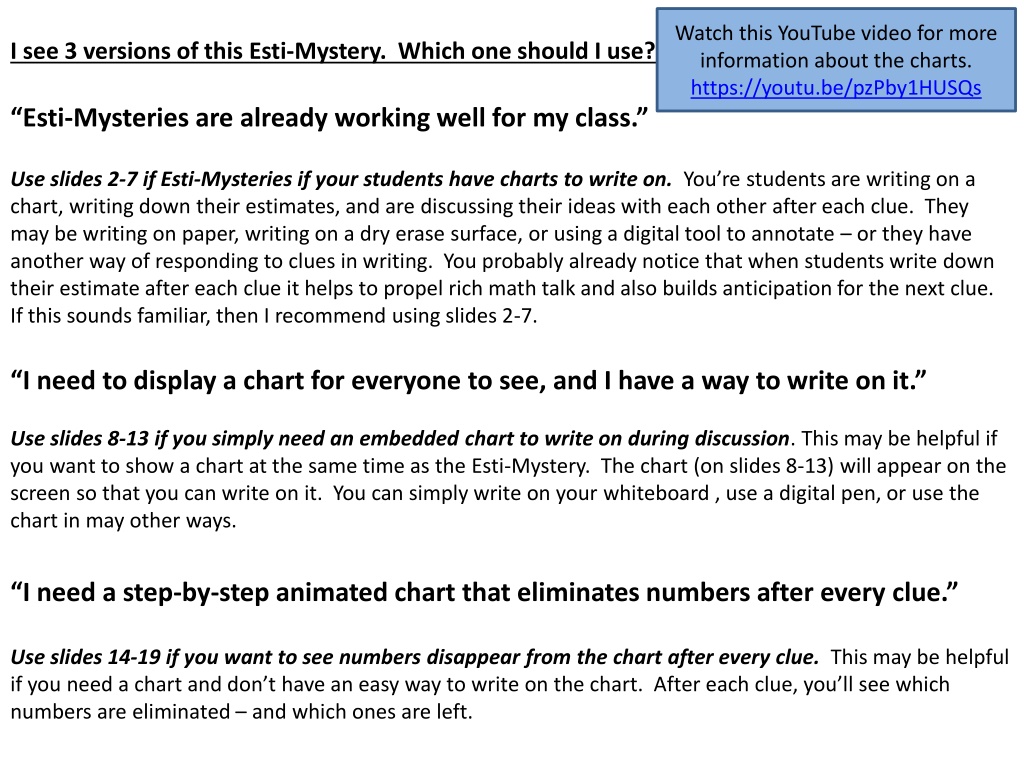 Watch this YouTube video for more information about the charts. https://youtu.be/pzPby1HUSQs I see 3 versions of this Esti-Mystery. Which one should I use? Esti-Mysteries are already working well for my class. Use slides 2-7 if Esti-Mysteries if your students have charts to write on. You re students are writing on a chart, writing down their estimates, and are discussing their ideas with each other after each clue. They may be writing on paper, writing on a dry erase surface, or using a digital tool to annotate or they have another way of responding to clues in writing. You probably already notice that when students write down their estimate after each clue it helps to propel rich math talk and also builds anticipation for the next clue. If this sounds familiar, then I recommend using slides 2-7. I need to display a chart for everyone to see, and I have a way to write on it. Use slides 8-13 if you simply need an embedded chart to write on during discussion. This may be helpful if you want to show a chart at the same time as the Esti-Mystery. The chart (on slides 8-13) will appear on the screen so that you can write on it. You can simply write on your whiteboard , use a digital pen, or use the chart in may other ways. I need a step-by-step animated chart that eliminates numbers after every clue. Use slides 14-19 if you want to see numbers disappear from the chart after every clue. This may be helpful if you need a chart and don t have an easy way to write on the chart. After each clue, you ll see which numbers are eliminated and which ones are left.