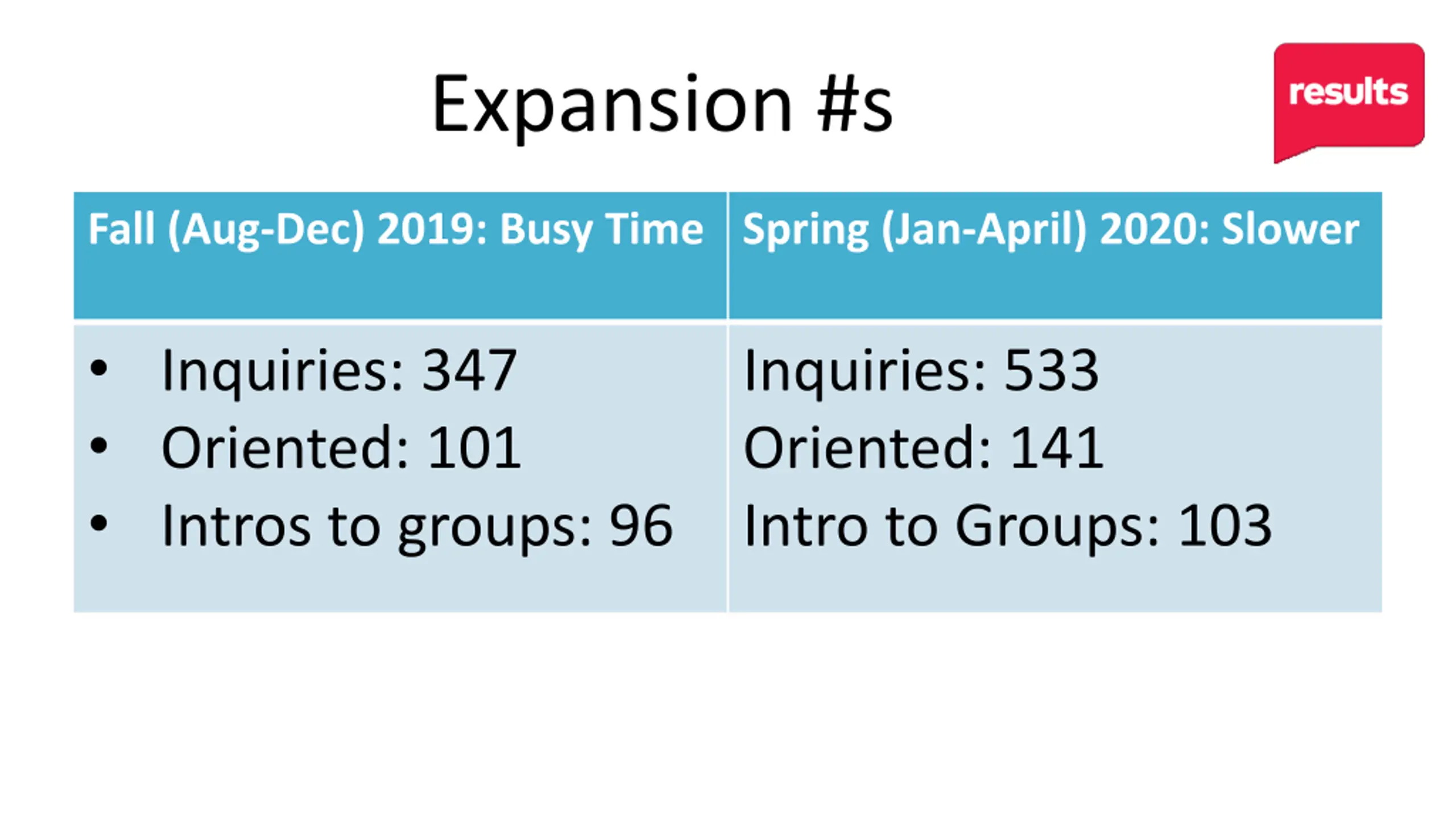 Expansion #s Fall (Aug-Dec) 2019: Busy Time Spring (Jan-April) 2020: Slower Inquiries: 347 Oriented: 101 Intros to groups: 96 Inquiries: 533 Oriented: 141 Intro to Groups: 103