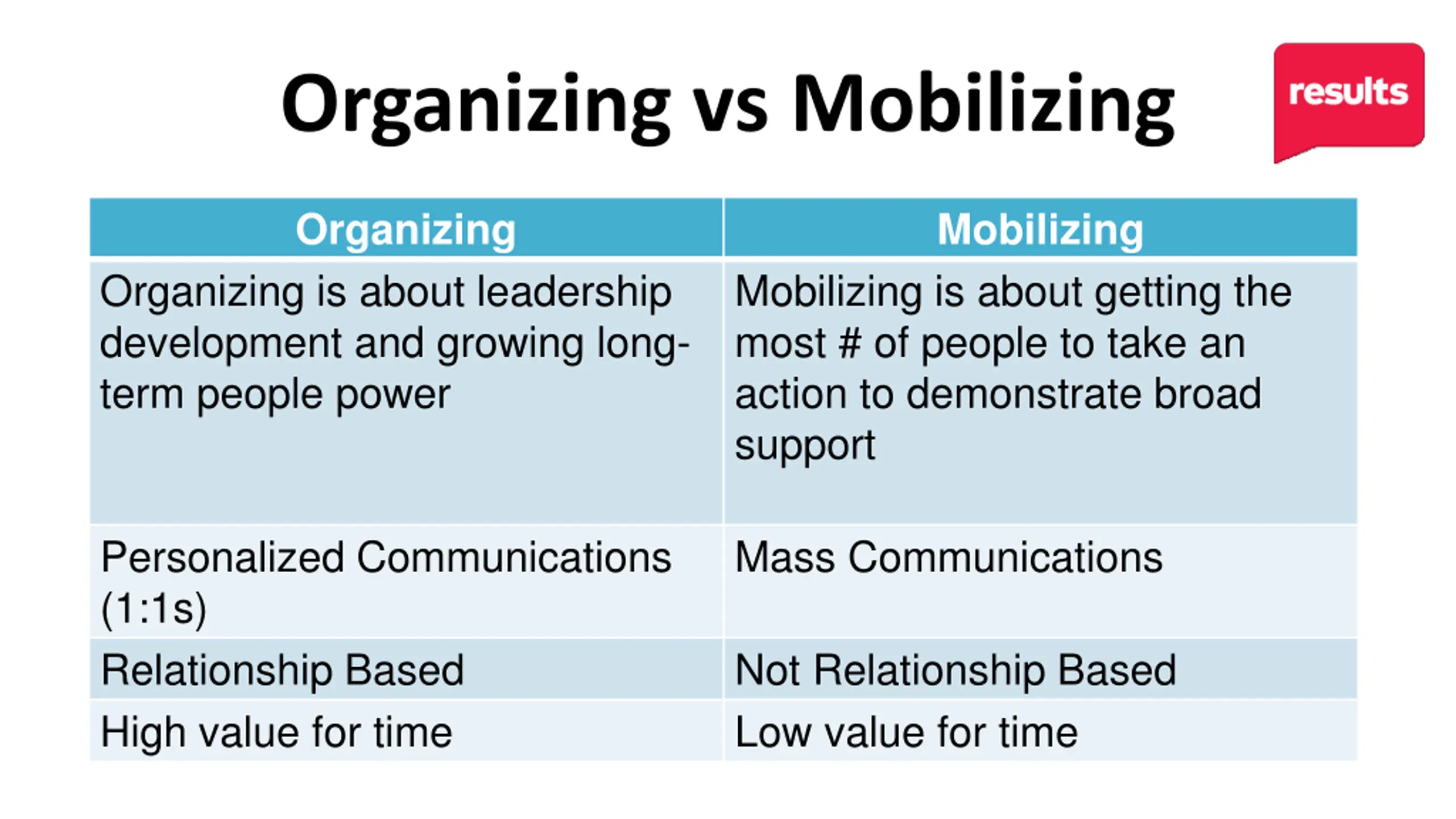 Organizing vs Mobilizing Organizing Mobilizing Organizing is about leadership development and growing long- term people power Mobilizing is about getting the most # of people to take an action to demonstrate broad support Personalized Communications (1:1s) Relationship Based High value for time Mass Communications Not Relationship Based Low value for time