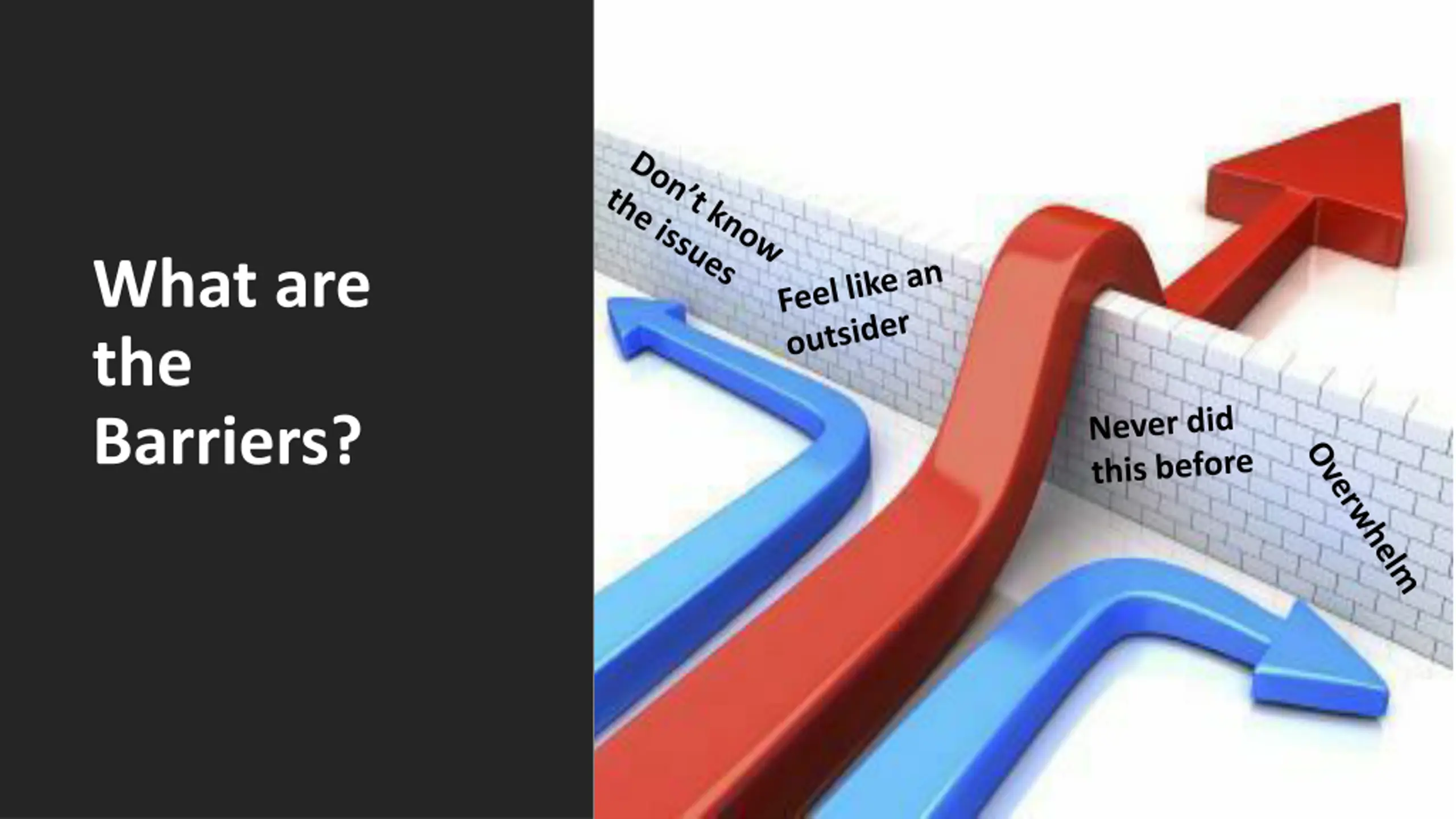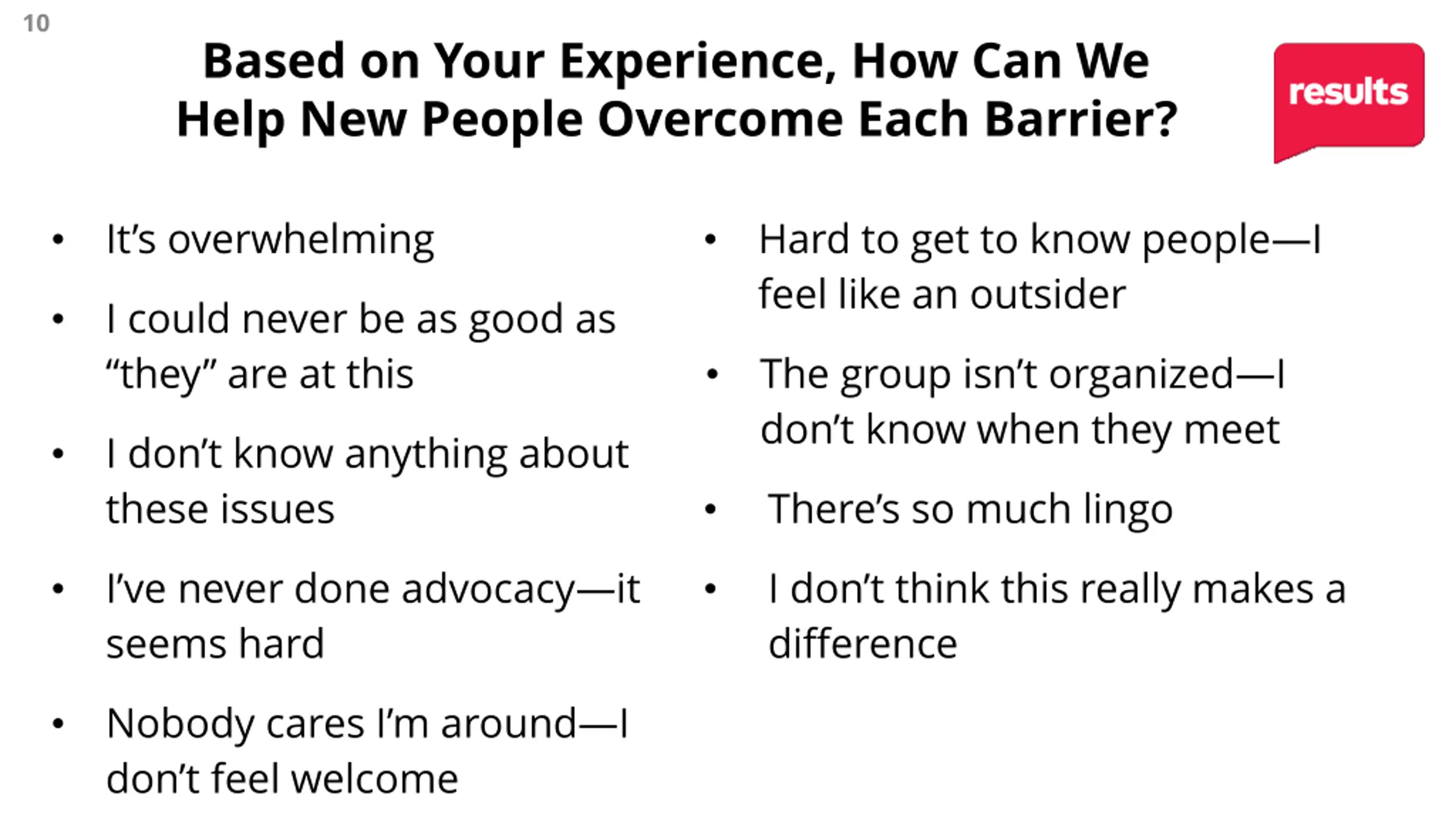 10 Based on Your Experience, How Can We Help New People Overcome Each Barrier? It s overwhelming Hard to get to know people I feel like an outsider I could never be as good as they are at this The group isn t organized I don t know when they meet I don t know anything about these issues There s so much lingo I ve never done advocacy it seems hard I don t think this really makes a difference Nobody cares I m around I don t feel welcome