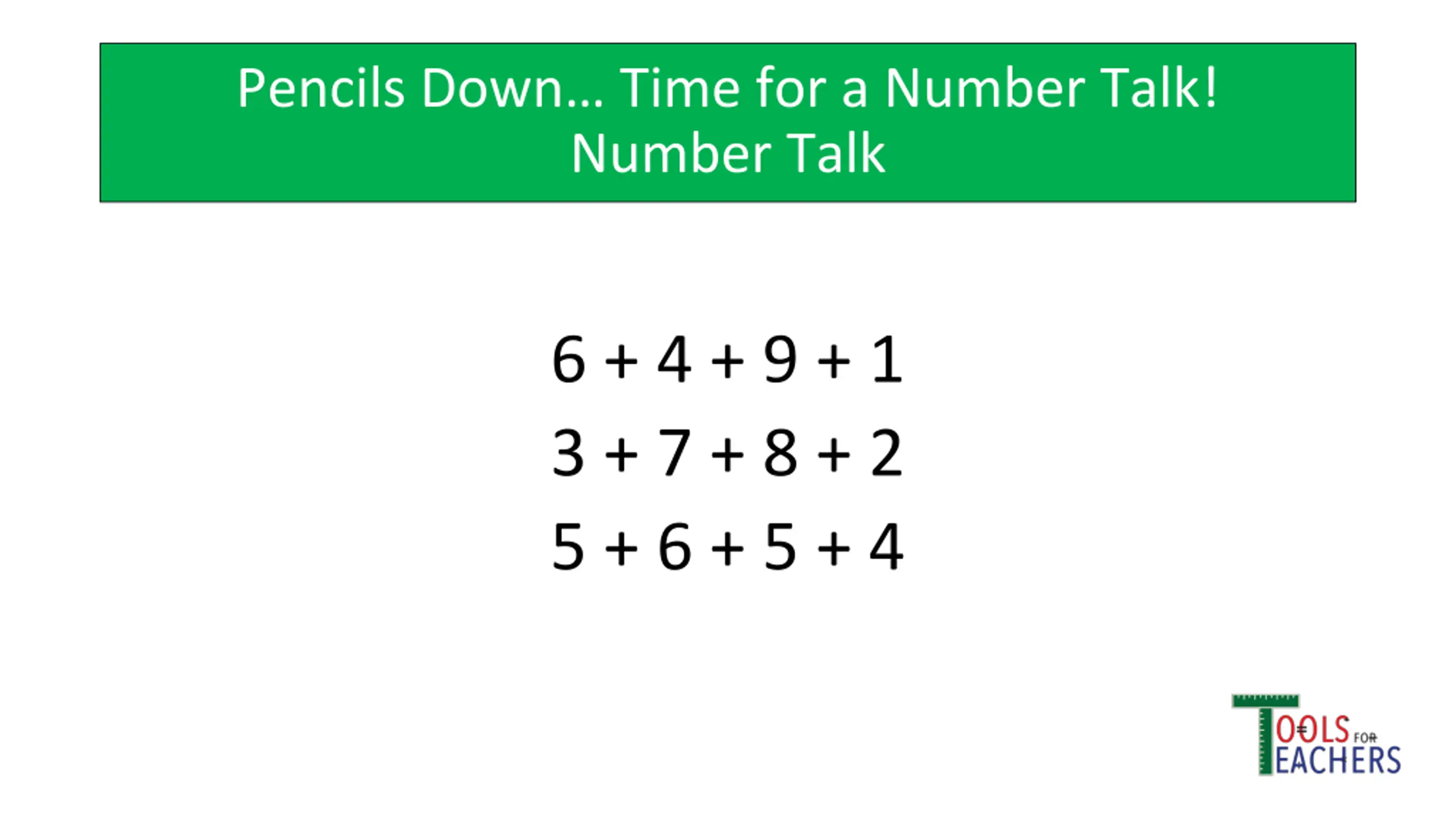 Pencils Down Time for a Number Talk! Number Talk 6 + 4 + 9 + 1 3 + 7 + 8 + 2 5 + 6 + 5 + 4