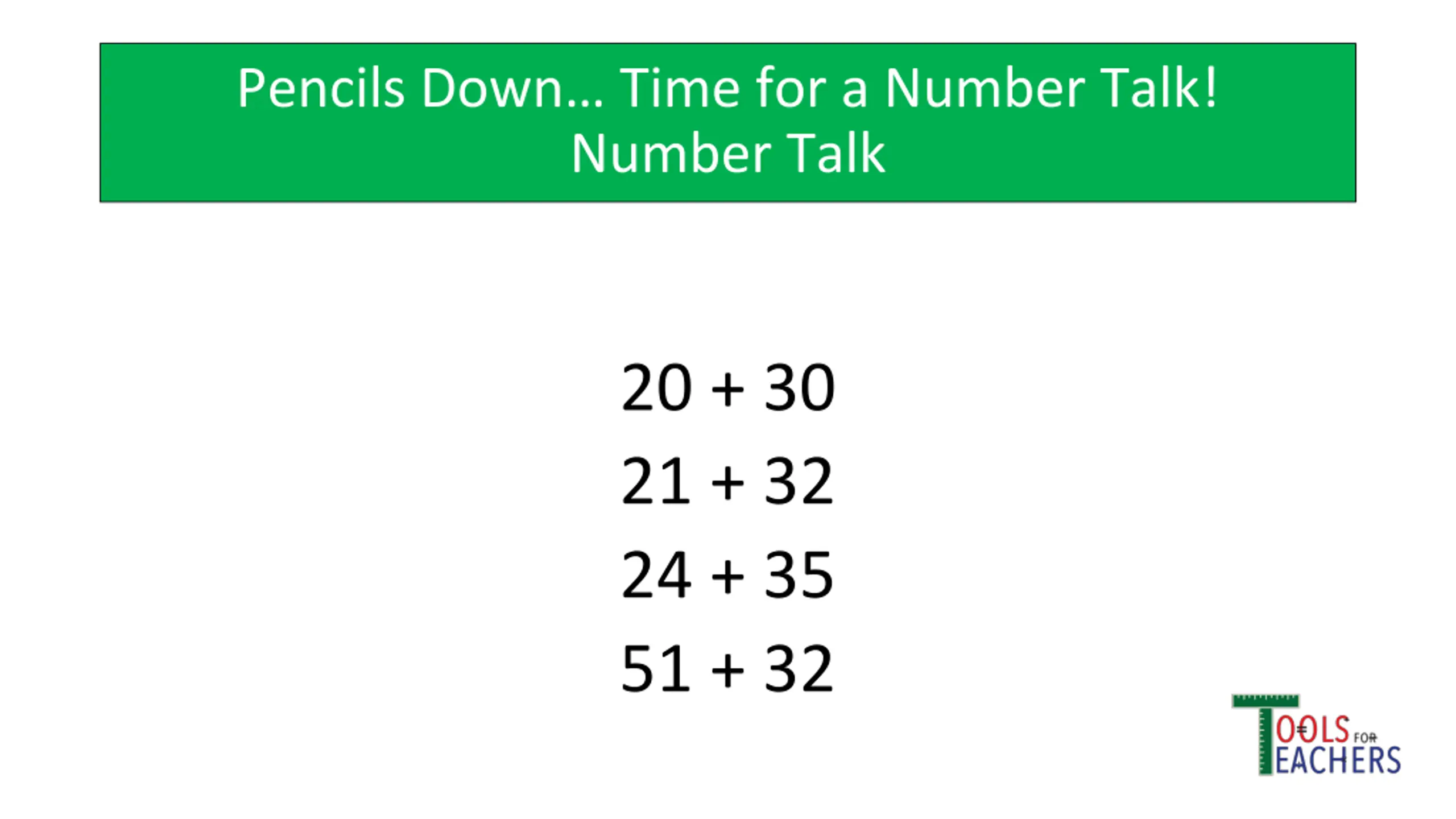 Pencils Down Time for a Number Talk! Number Talk 20 + 30 21 + 32 24 + 35 51 + 32