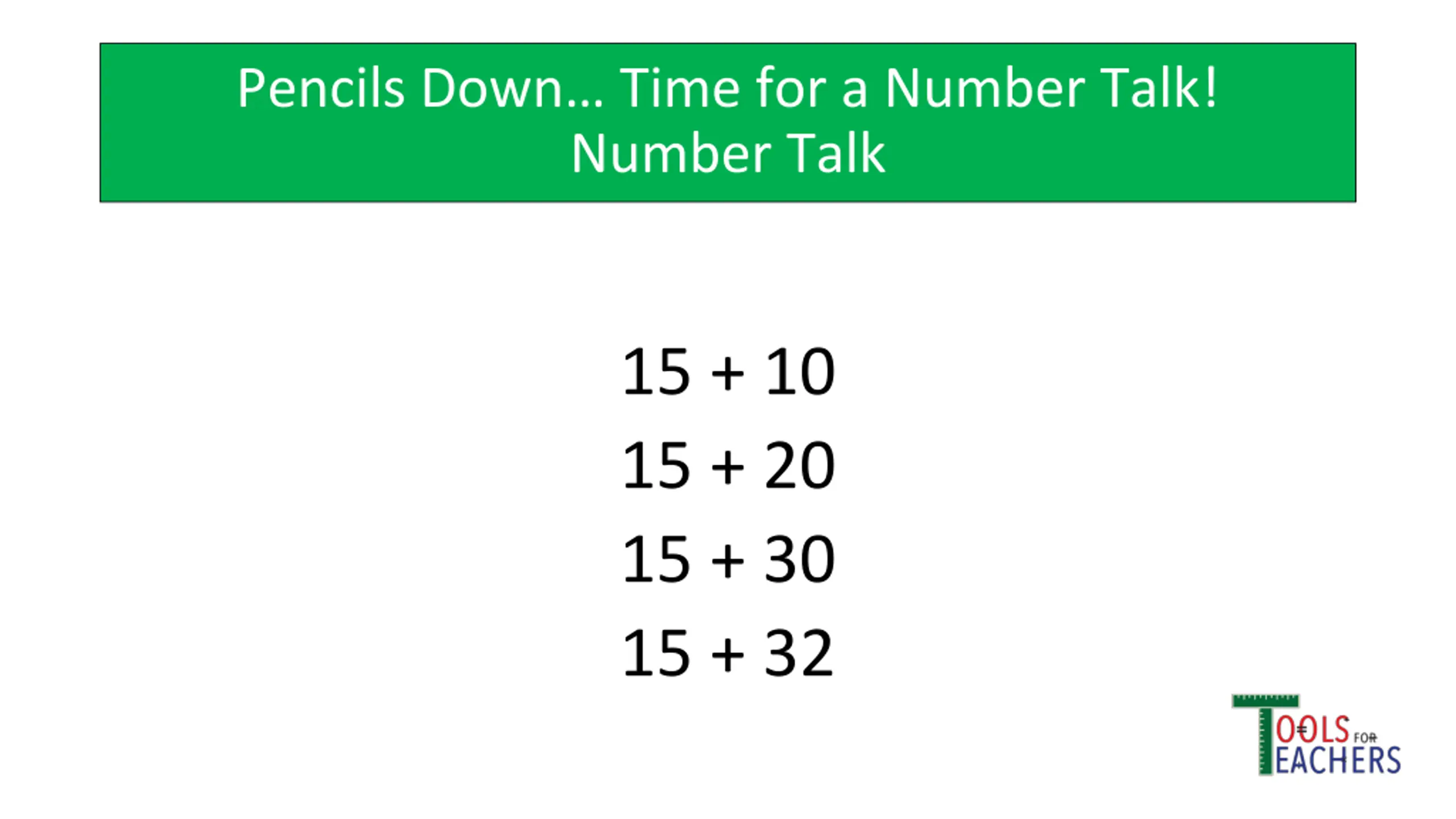 Pencils Down Time for a Number Talk! Number Talk 15 + 10 15 + 20 15 + 30 15 + 32