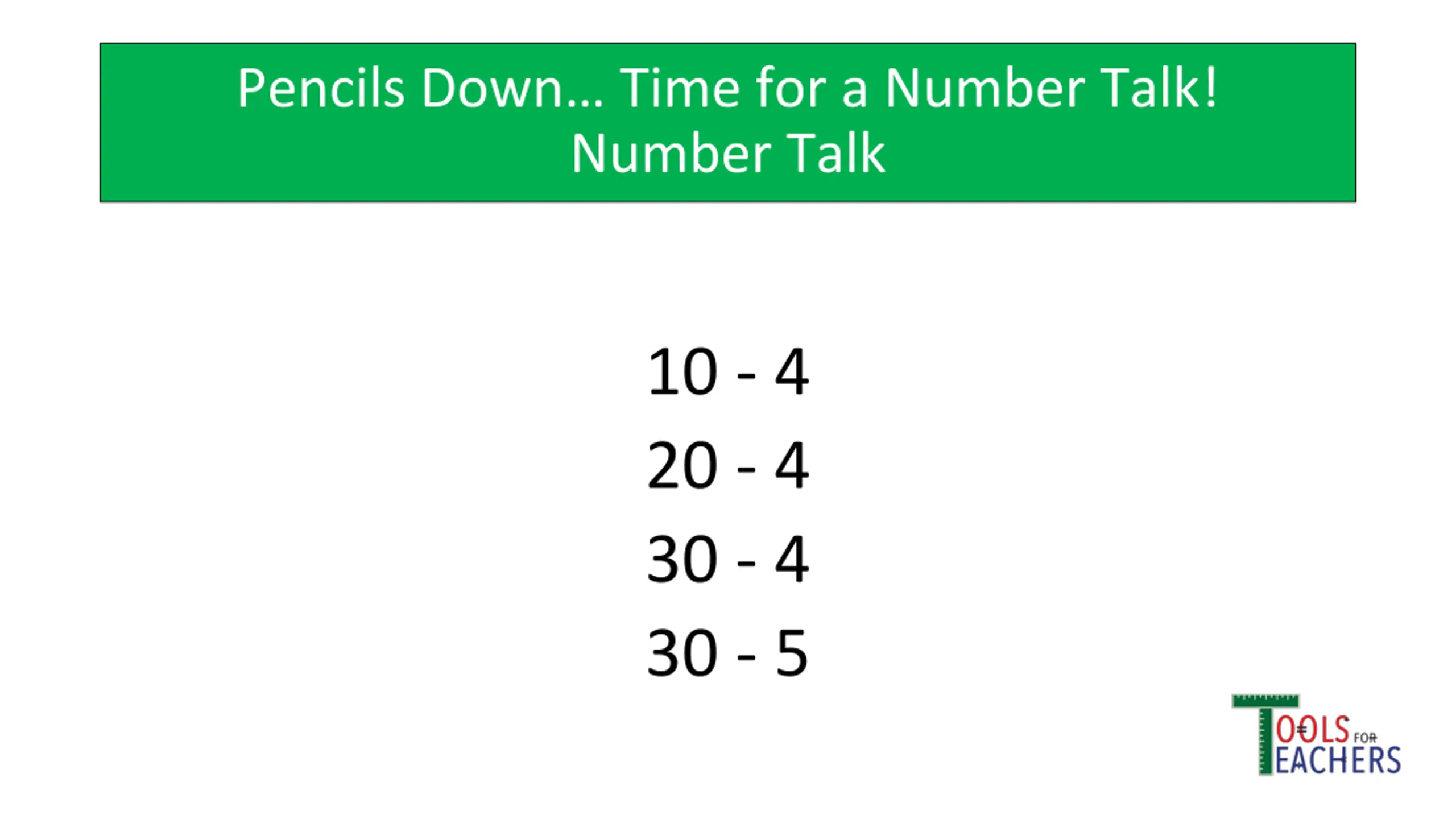 Pencils Down Time for a Number Talk! Number Talk 10 - 4 20 - 4 30 - 4 30 - 5