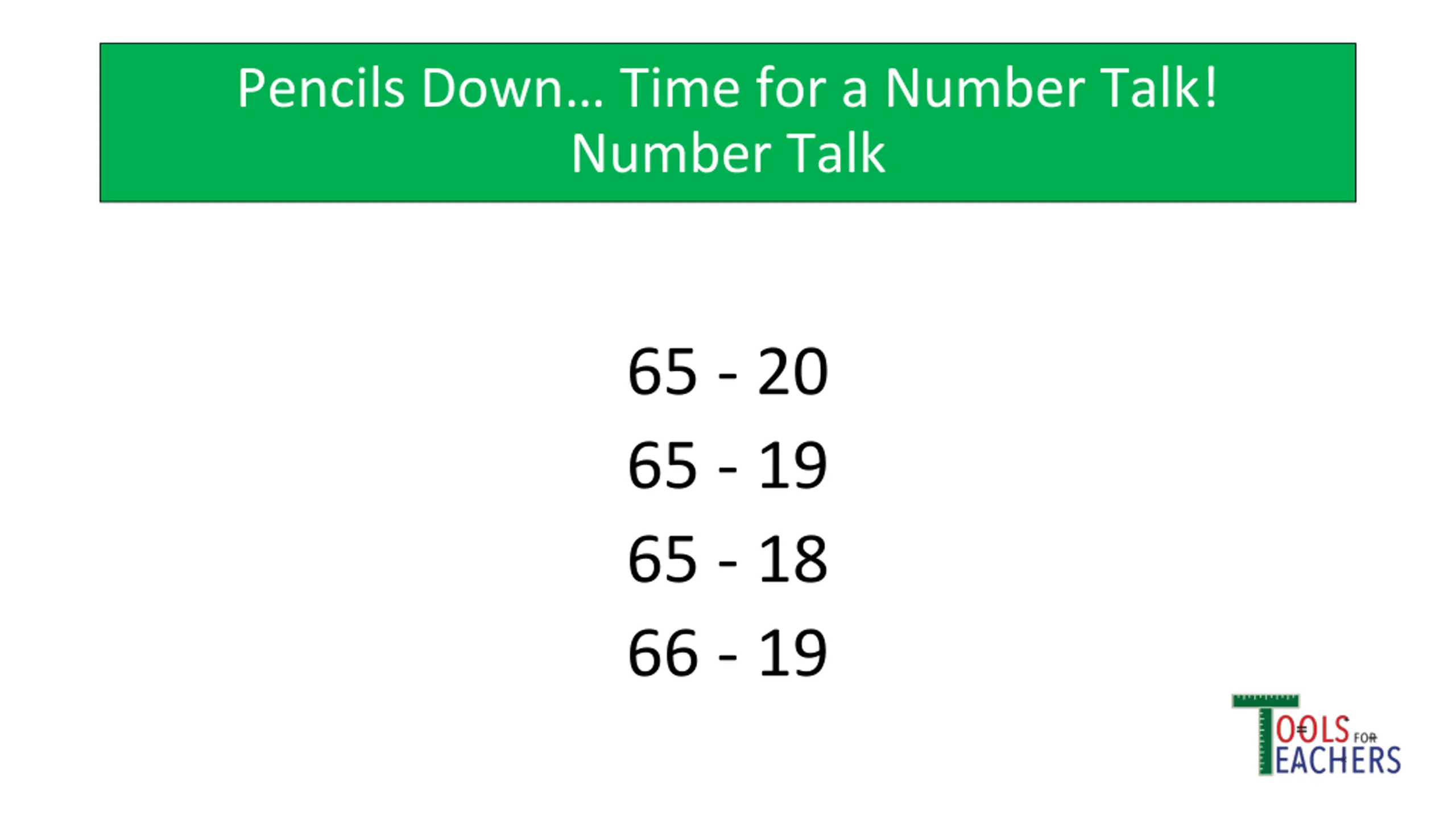 Pencils Down Time for a Number Talk! Number Talk 65 - 20 65 - 19 65 - 18 66 - 19