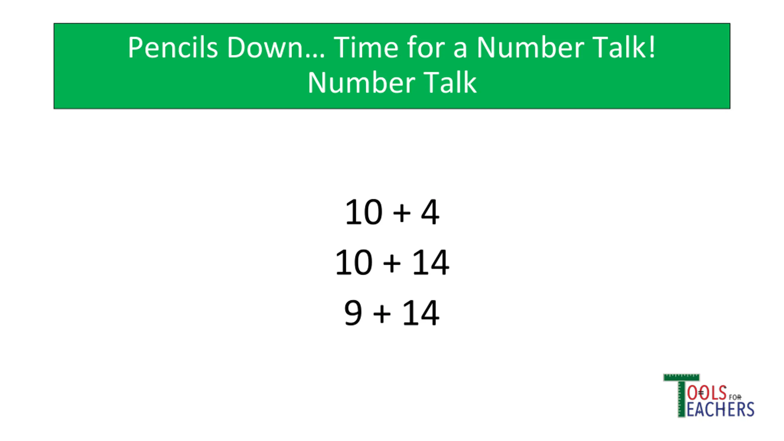 Pencils Down Time for a Number Talk! Number Talk 10 + 4 10 + 14 9 + 14