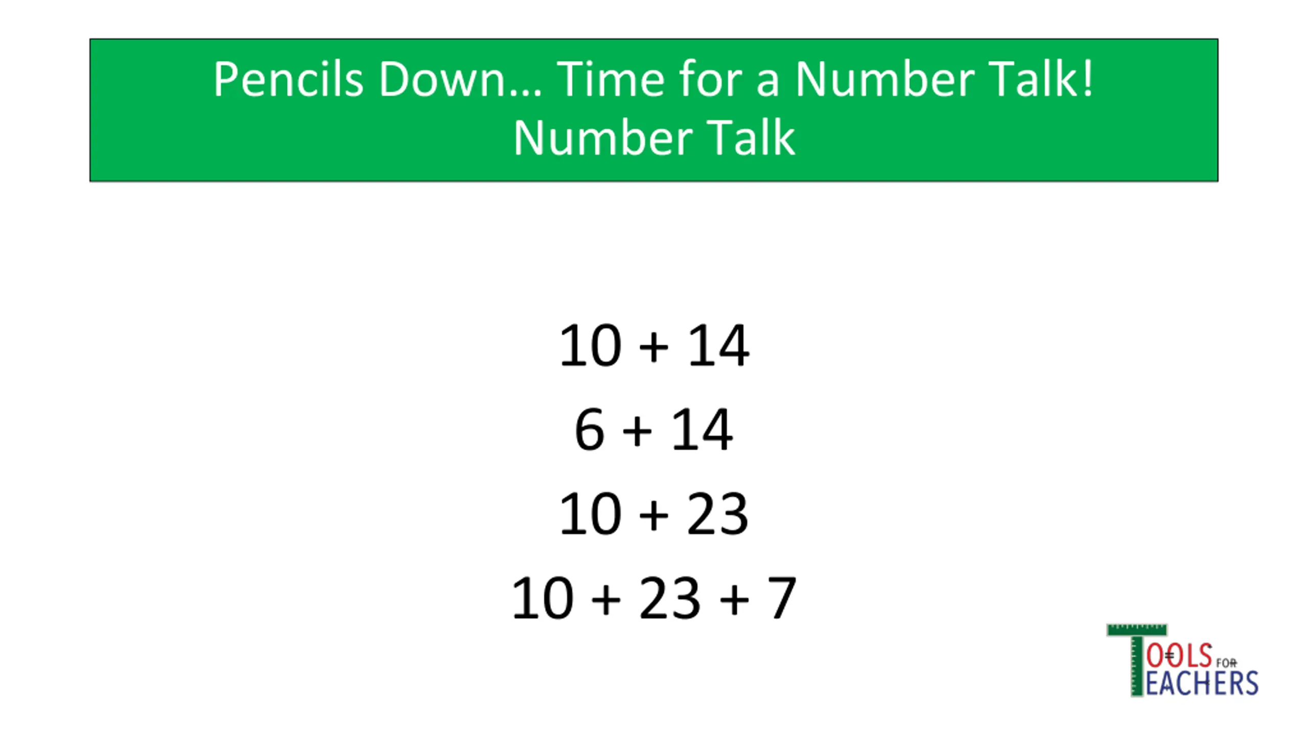 Pencils Down Time for a Number Talk! Number Talk 10 + 14 6 + 14 10 + 23 10 + 23 + 7