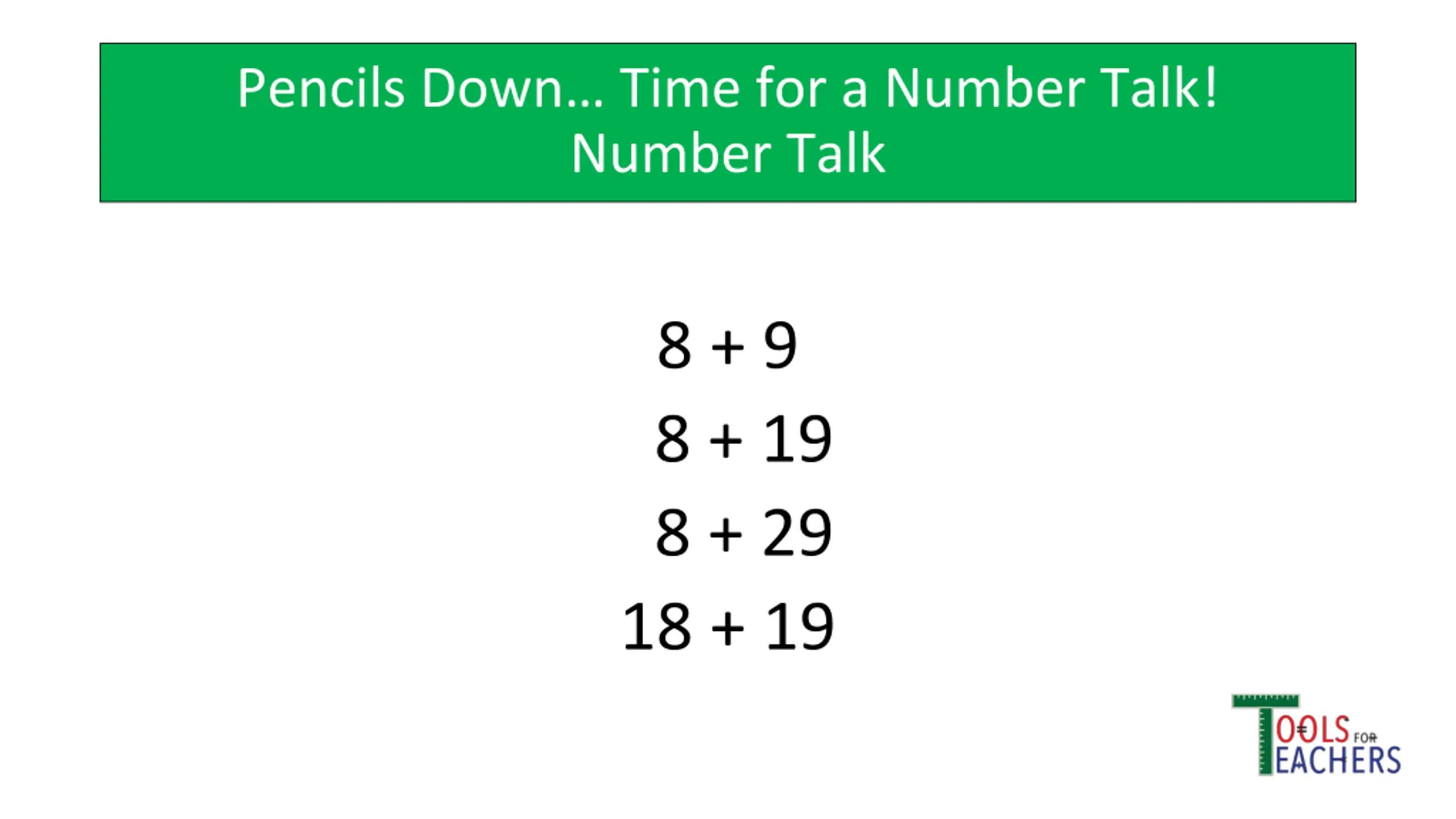 Pencils Down Time for a Number Talk! Number Talk 8 + 9 8 + 19 8 + 29 18 + 19