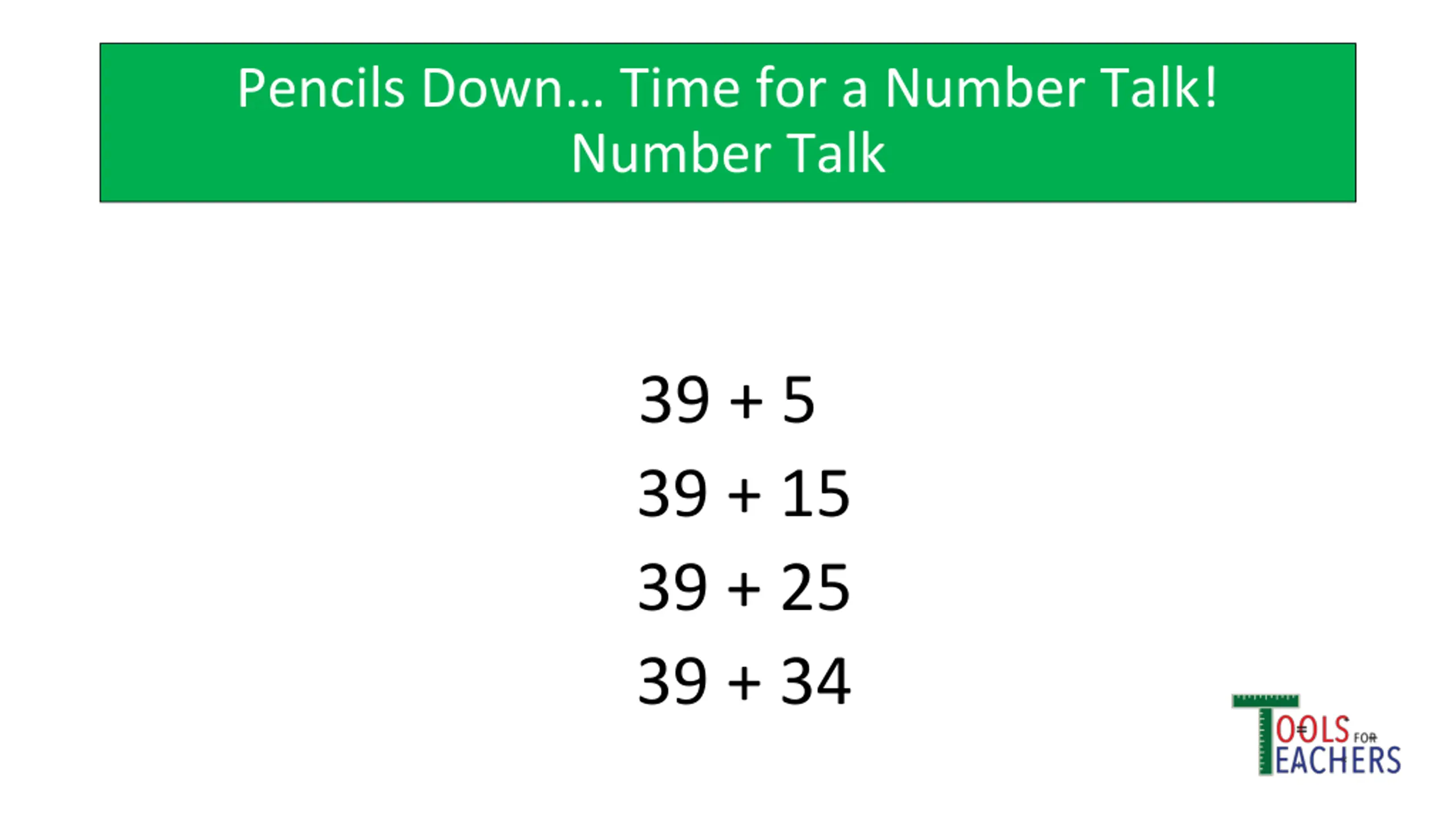 Pencils Down Time for a Number Talk! Number Talk 39 + 5 39 + 15 39 + 25 39 + 34