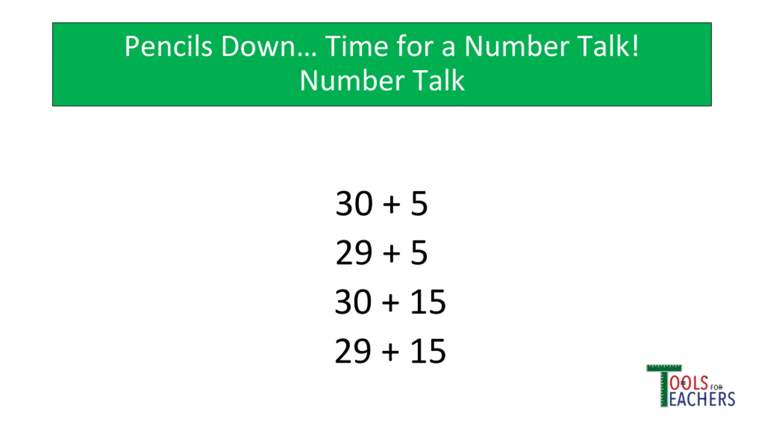 Pencils Down Time for a Number Talk! Number Talk 30 + 5 29 + 5 30 + 15 29 + 15