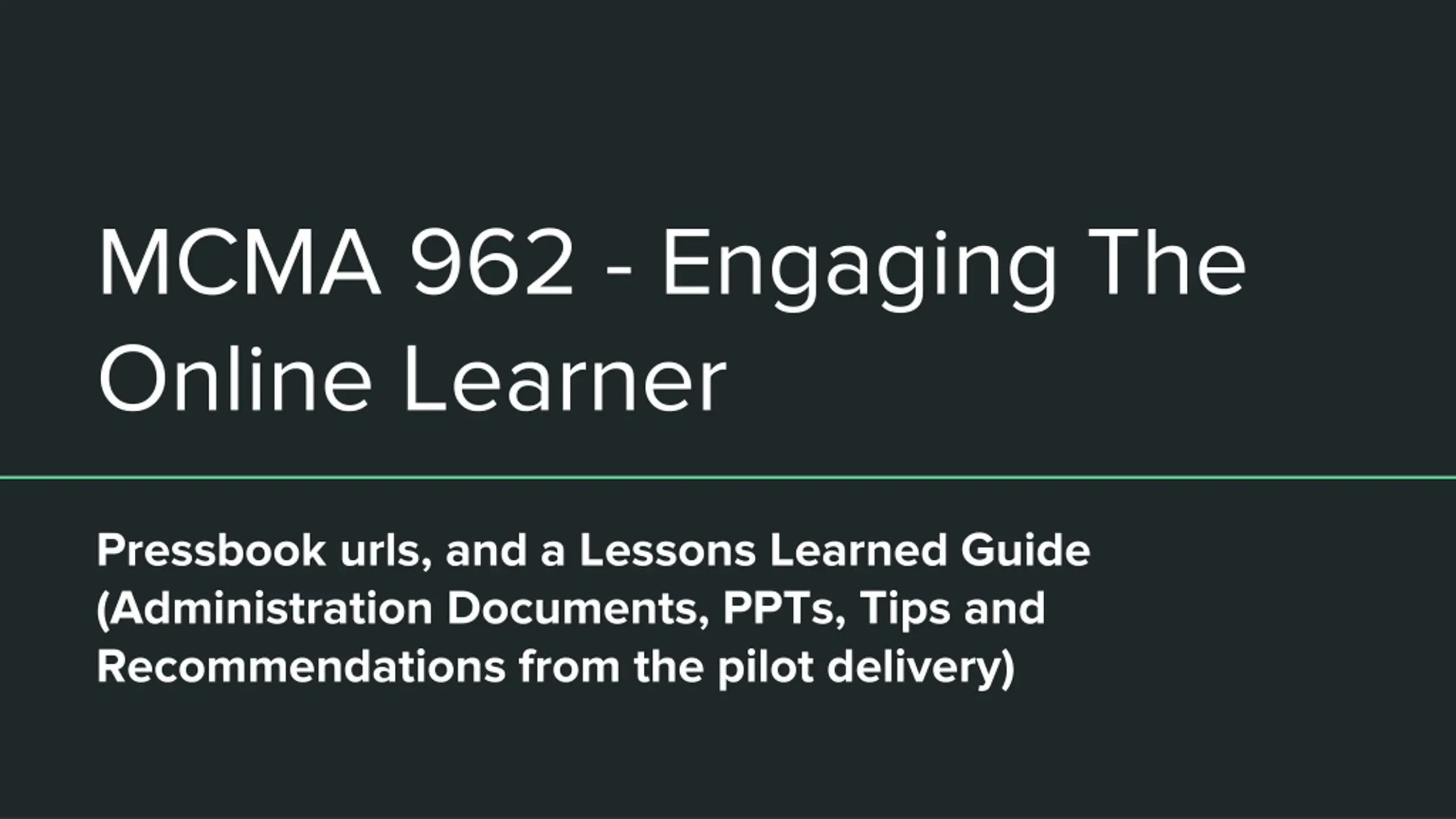 MCMA 962 - Engaging The Online Learner Pressbook urls, and a Lessons Learned Guide (Administration Documents, PPTs, Tips and Recommendations from the pilot delivery)