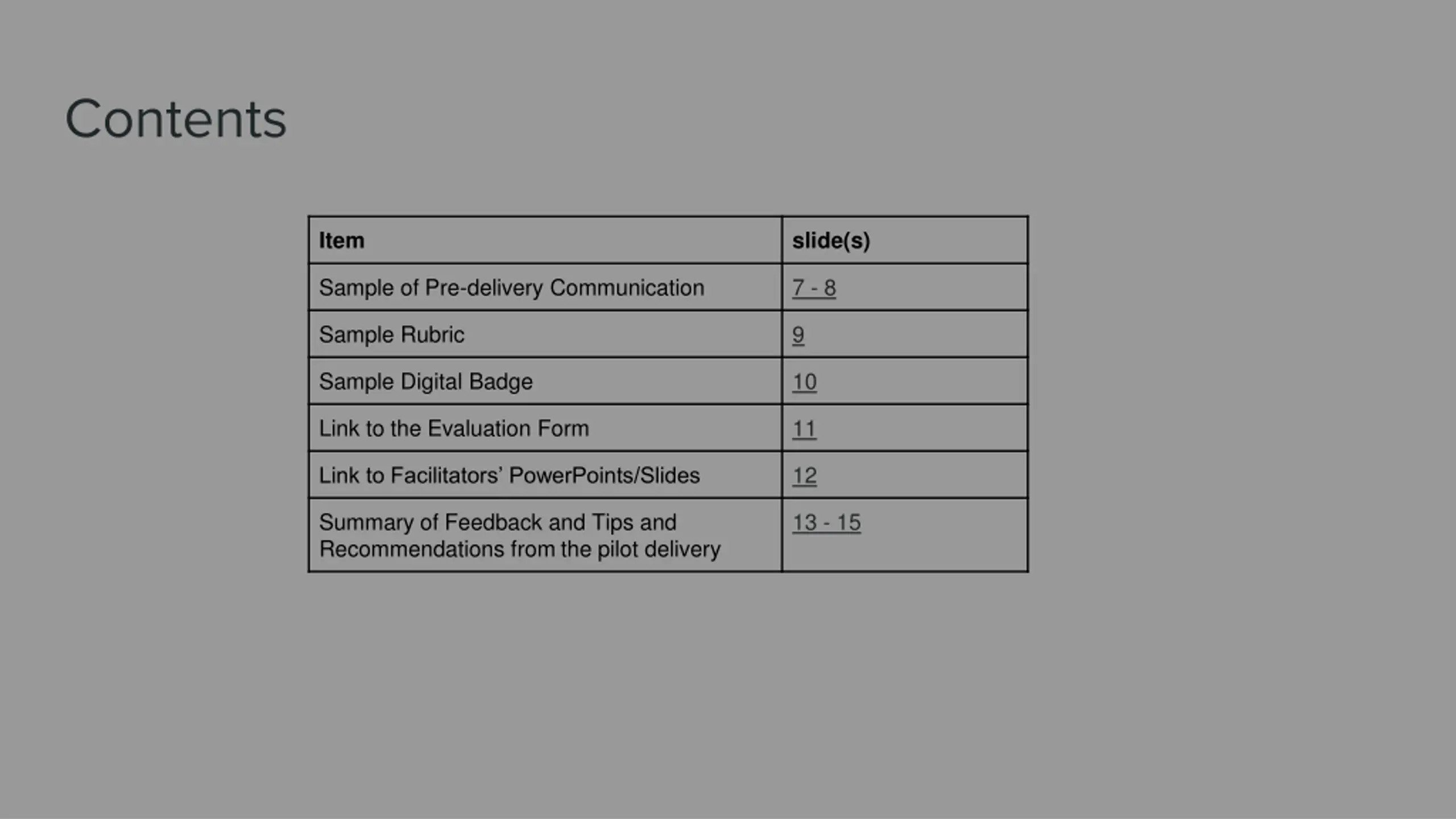 Contents Item slide(s) Sample of Pre-delivery Communication 7 - 8 Sample Rubric 9 Sample Digital Badge 10 Link to the Evaluation Form 11 12 Link to Facilitators PowerPoints/Slides Summary of Feedback and Tips and Recommendations from the pilot delivery 13 - 15
