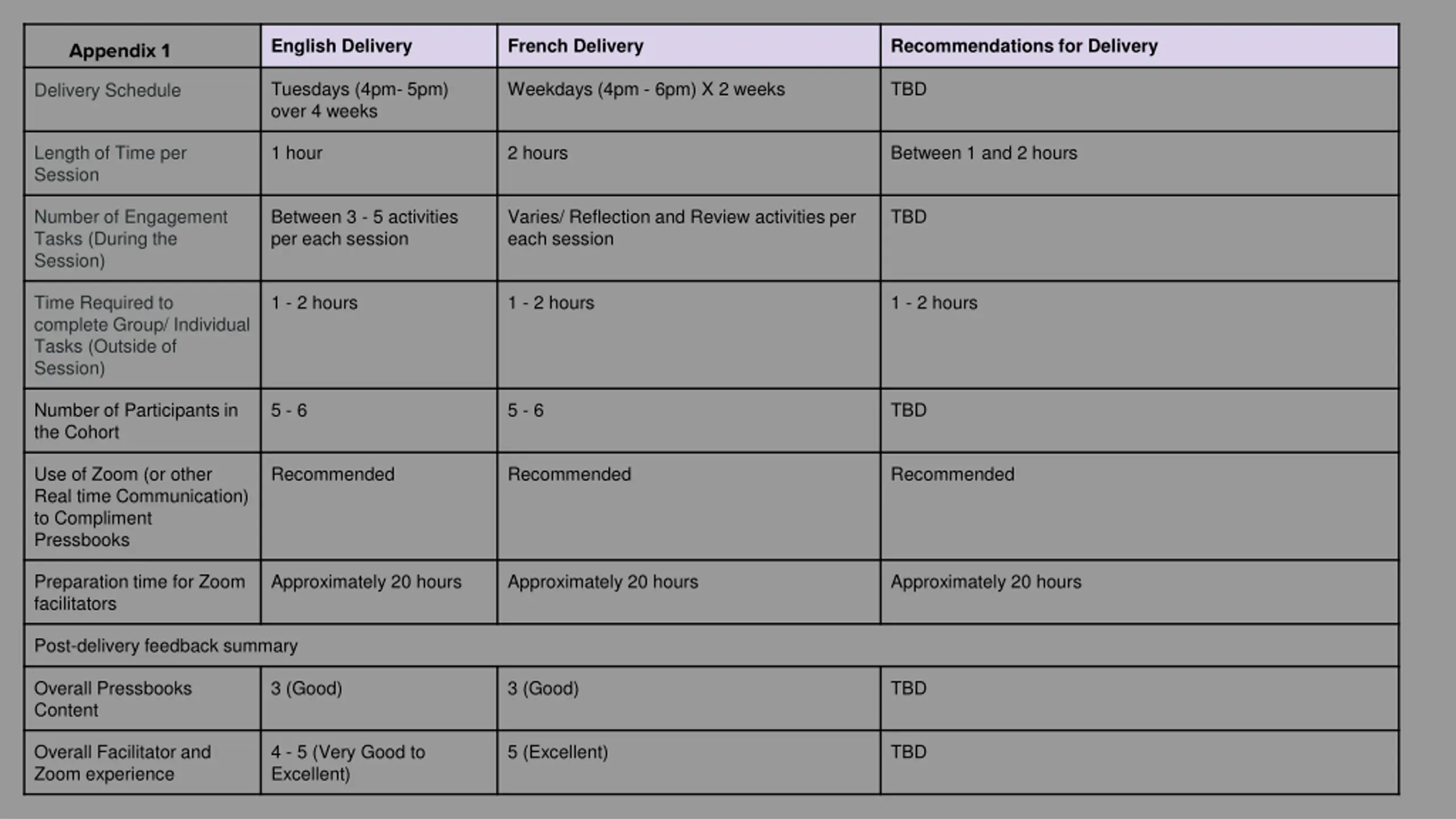 English Delivery French Delivery Recommendations for Delivery Appendix 1 Tuesdays (4pm- 5pm) over 4 weeks Weekdays (4pm - 6pm) X 2 weeks TBD Delivery Schedule Length of Time per Session 1 hour 2 hours Between 1 and 2 hours Number of Engagement Tasks (During the Session) Between 3 - 5 activities per each session Varies/ Reflection and Review activities per each session TBD Time Required to complete Group/ Individual Tasks (Outside of Session) 1 - 2 hours 1 - 2 hours 1 - 2 hours Number of Participants in the Cohort 5 - 6 5 - 6 TBD Use of Zoom (or other Real time Communication) to Compliment Pressbooks Recommended Recommended Recommended Preparation time for Zoom facilitators Approximately 20 hours Approximately 20 hours Approximately 20 hours Post-delivery feedback summary Overall Pressbooks Content 3 (Good) 3 (Good) TBD Overall Facilitator and Zoom experience 4 - 5 (Very Good to Excellent) 5 (Excellent) TBD