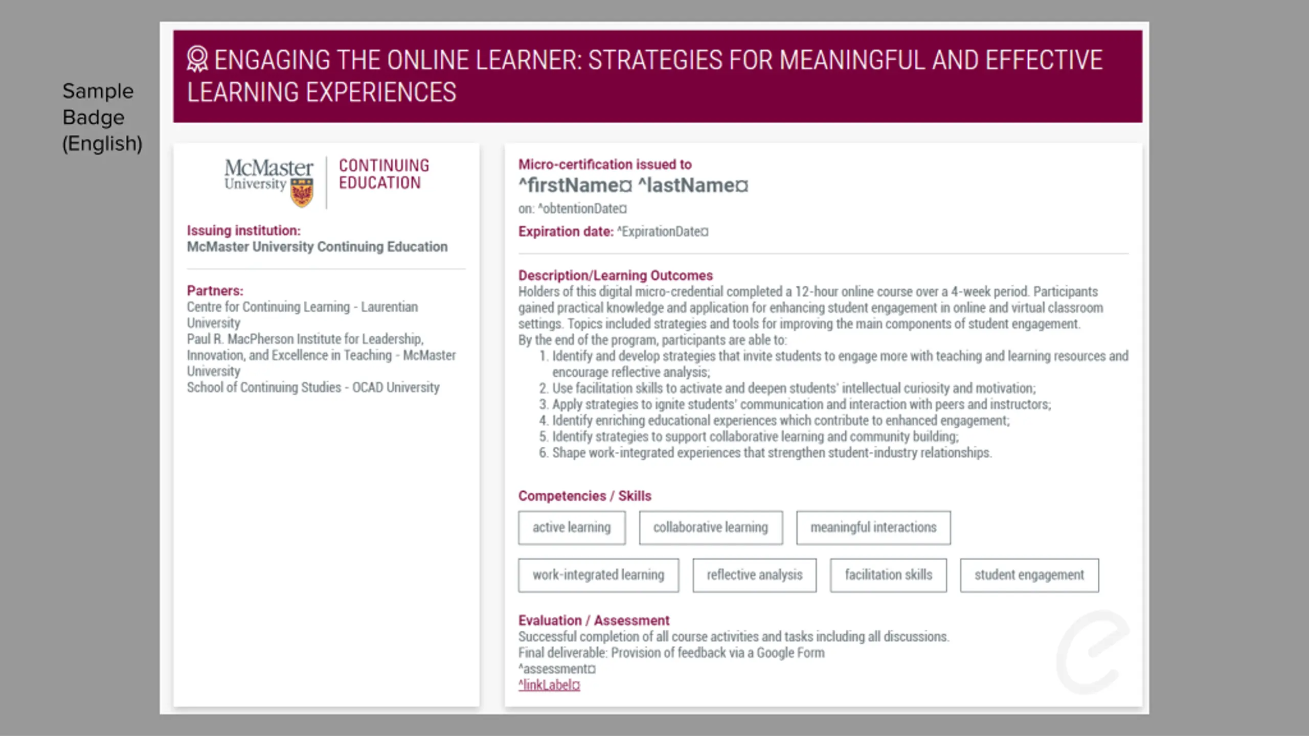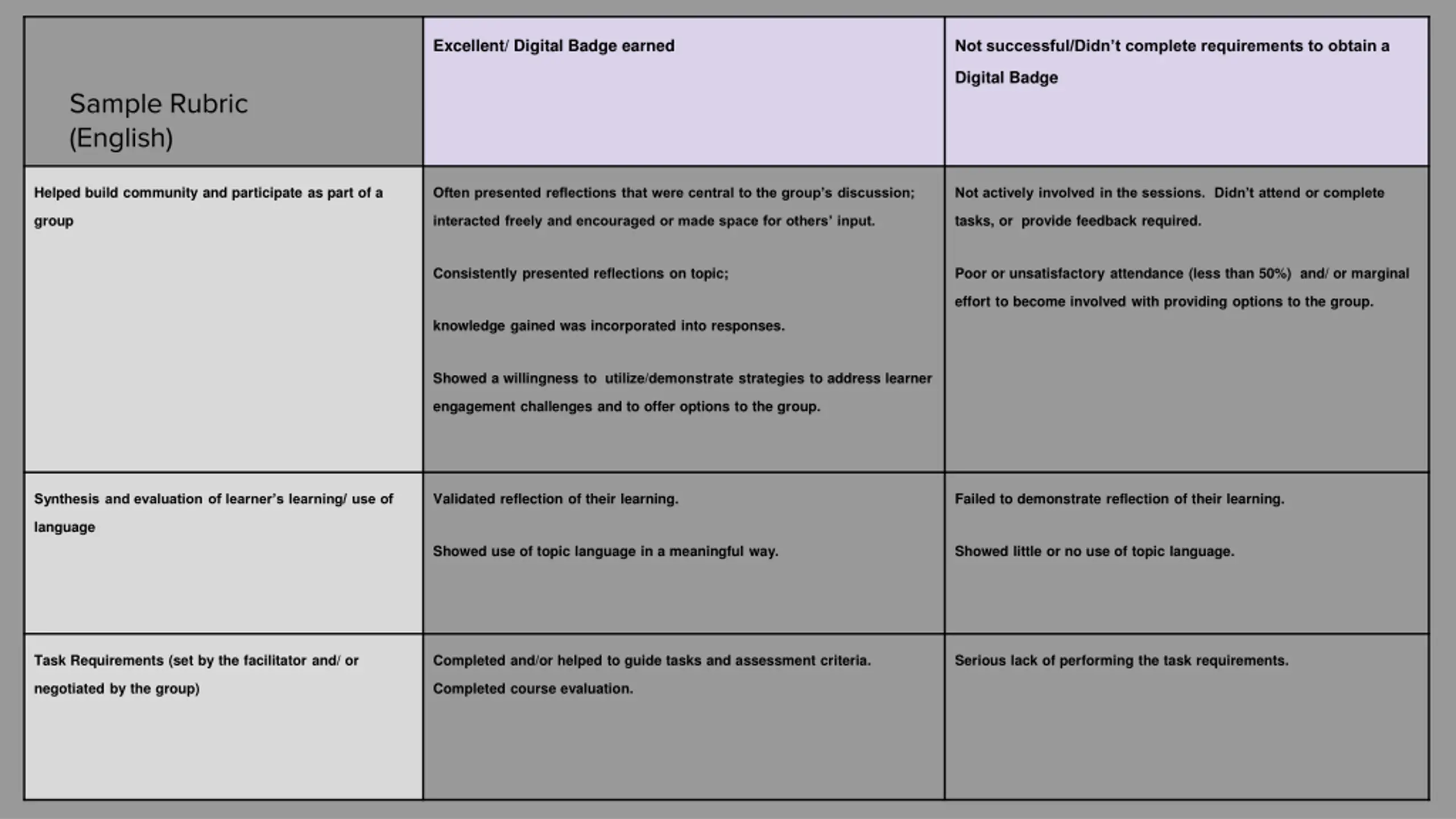 Excellent/ Digital Badge earned Not successful/Didn t complete requirements to obtain a Digital Badge Sample Rubric (English) Helped build community and participate as part of a Often presented reflections that were central to the group s discussion; Not actively involved in the sessions. Didn t attend or complete group tasks, or provide feedback required. interacted freely and encouraged or made space for others input. Consistently presented reflections on topic; Poor or unsatisfactory attendance (less than 50%) and/ or marginal effort to become involved with providing options to the group. knowledge gained was incorporated into responses. Showed a willingness to utilize/demonstrate strategies to address learner engagement challenges and to offer options to the group. Validated reflection of their learning. Failed to demonstrate reflection of their learning. Synthesis and evaluation of learner s learning/ use of language Showed use of topic language in a meaningful way. Showed little or no use of topic language. Task Requirements (set by the facilitator and/ or Completed and/or helped to guide tasks and assessment criteria. Serious lack of performing the task requirements. negotiated by the group) Completed course evaluation.