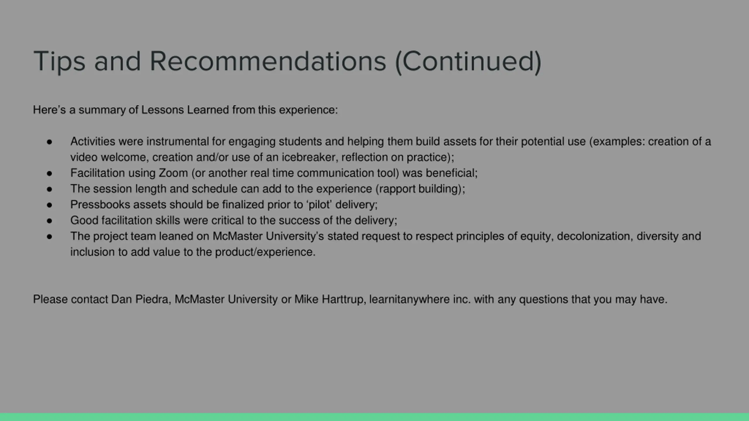 Tips and Recommendations (Continued) Here s a summary of Lessons Learned from this experience: Activities were instrumental for engaging students and helping them build assets for their potential use (examples: creation of a video welcome, creation and/or use of an icebreaker, reflection on practice); Facilitation using Zoom (or another real time communication tool) was beneficial; The session length and schedule can add to the experience (rapport building); Pressbooks assets should be finalized prior to pilot delivery; Good facilitation skills were critical to the success of the delivery; The project team leaned on McMaster University s stated request to respect principles of equity, decolonization, diversity and inclusion to add value to the product/experience. Please contact Dan Piedra, McMaster University or Mike Harttrup, learnitanywhere inc. with any questions that you may have.