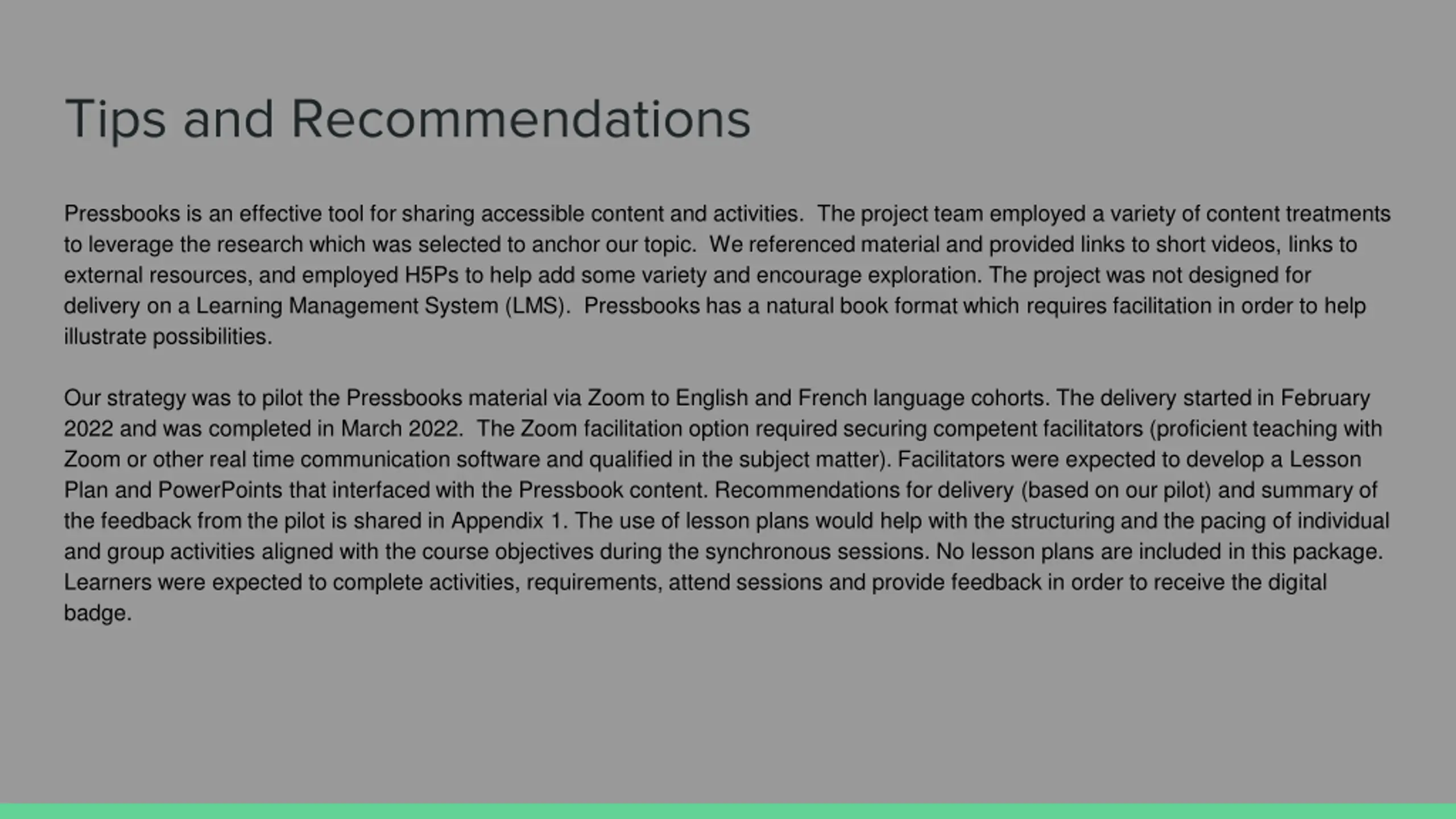 Tips and Recommendations Pressbooks is an effective tool for sharing accessible content and activities. The project team employed a variety of content treatments to leverage the research which was selected to anchor our topic. We referenced material and provided links to short videos, links to external resources, and employed H5Ps to help add some variety and encourage exploration. The project was not designed for delivery on a Learning Management System (LMS). Pressbooks has a natural book format which requires facilitation in order to help illustrate possibilities. Our strategy was to pilot the Pressbooks material via Zoom to English and French language cohorts. The delivery started in February 2022 and was completed in March 2022. The Zoom facilitation option required securing competent facilitators (proficient teaching with Zoom or other real time communication software and qualified in the subject matter). Facilitators were expected to develop a Lesson Plan and PowerPoints that interfaced with the Pressbook content. Recommendations for delivery (based on our pilot) and summary of the feedback from the pilot is shared in Appendix 1. The use of lesson plans would help with the structuring and the pacing of individual and group activities aligned with the course objectives during the synchronous sessions. No lesson plans are included in this package. Learners were expected to complete activities, requirements, attend sessions and provide feedback in order to receive the digital badge.