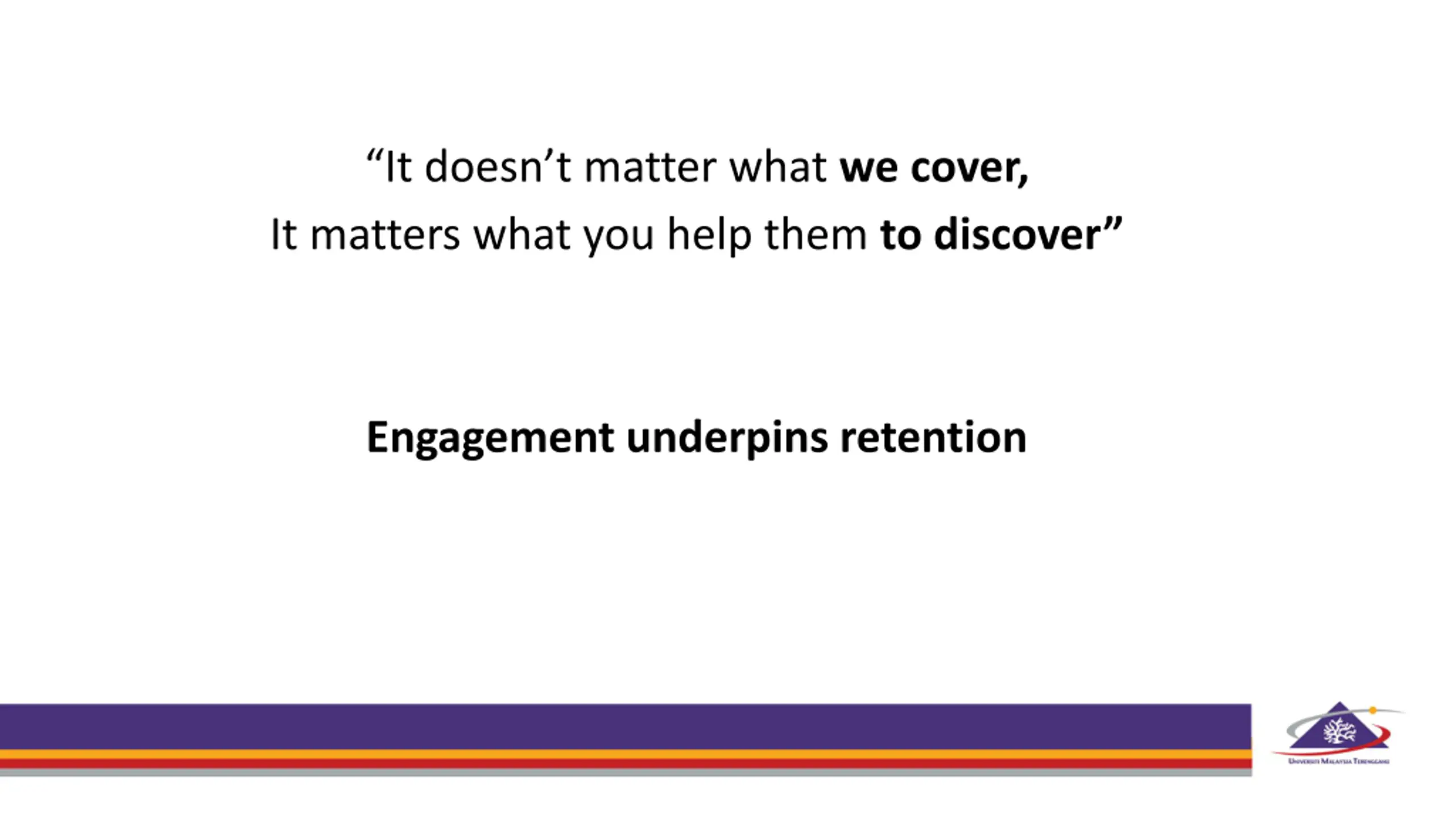 It doesnt matter what we cover, It matters what you help them to discover Engagement underpins retention