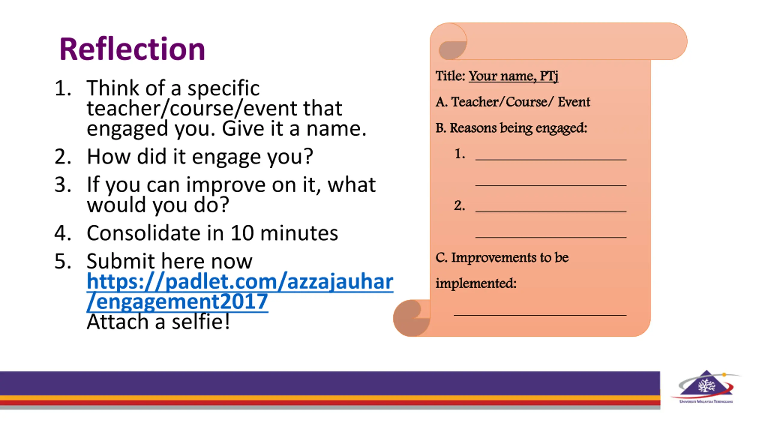 Reflection 1. Think of a specific teacher/course/event that engaged you. Give it a name. 2. How did it engage you? 3. If you can improve on it, what would you do? 4. Consolidate in 10 minutes 5. Submit here now https://padlet.com/azzajauhar /engagement2017 Attach a selfie! Title: Title: Your name, Your name, PTj PTj A. Teacher/Course/ Event A. Teacher/Course/ Event B. Reasons being engaged: B. Reasons being engaged: 1. 1. 2. 2. C. Improvements to be C. Improvements to be implemented: implemented: