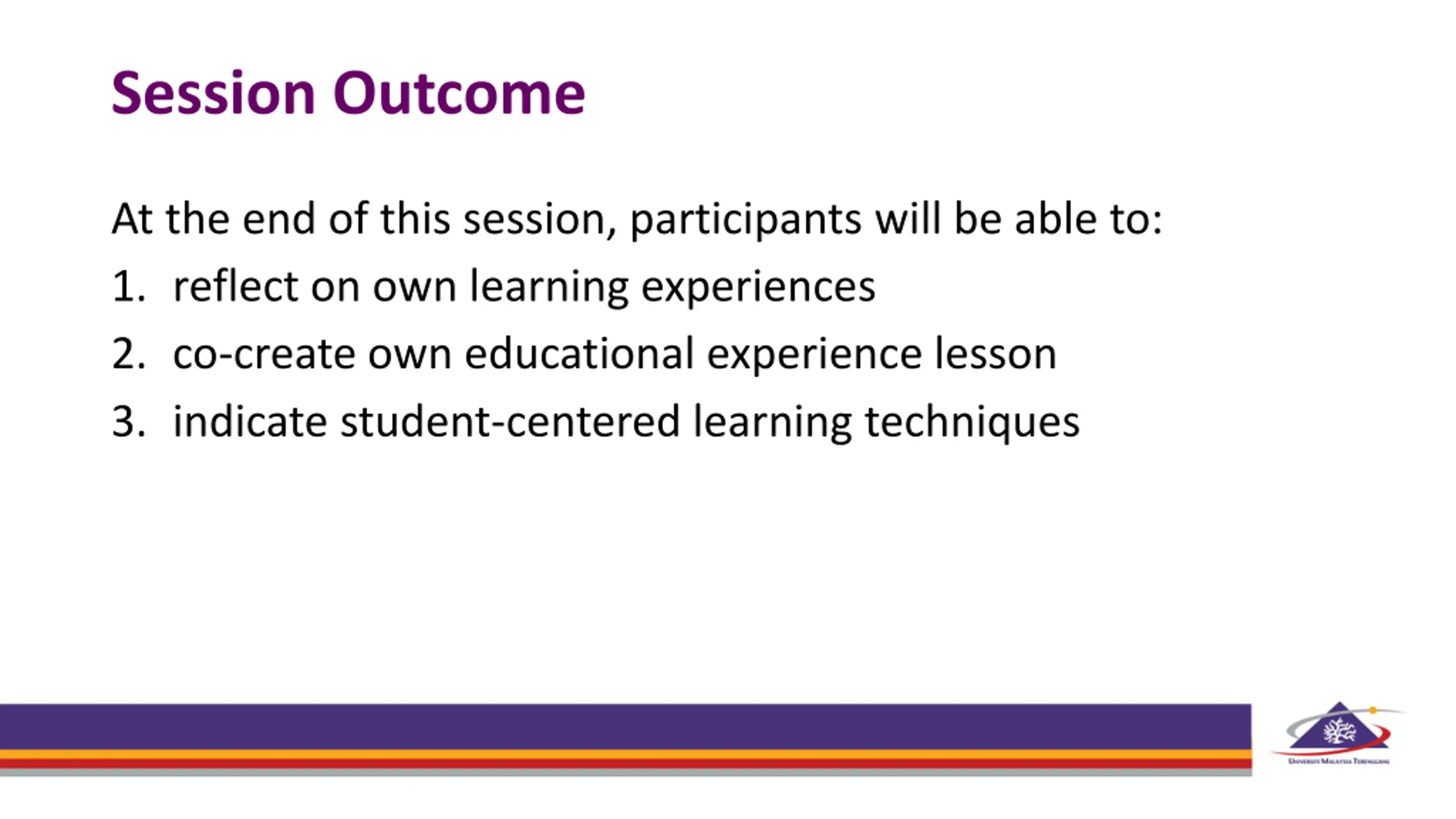 Session Outcome At the end of this session, participants will be able to: 1. reflect on own learning experiences 2. co-create own educational experience lesson 3. indicate student-centered learning techniques