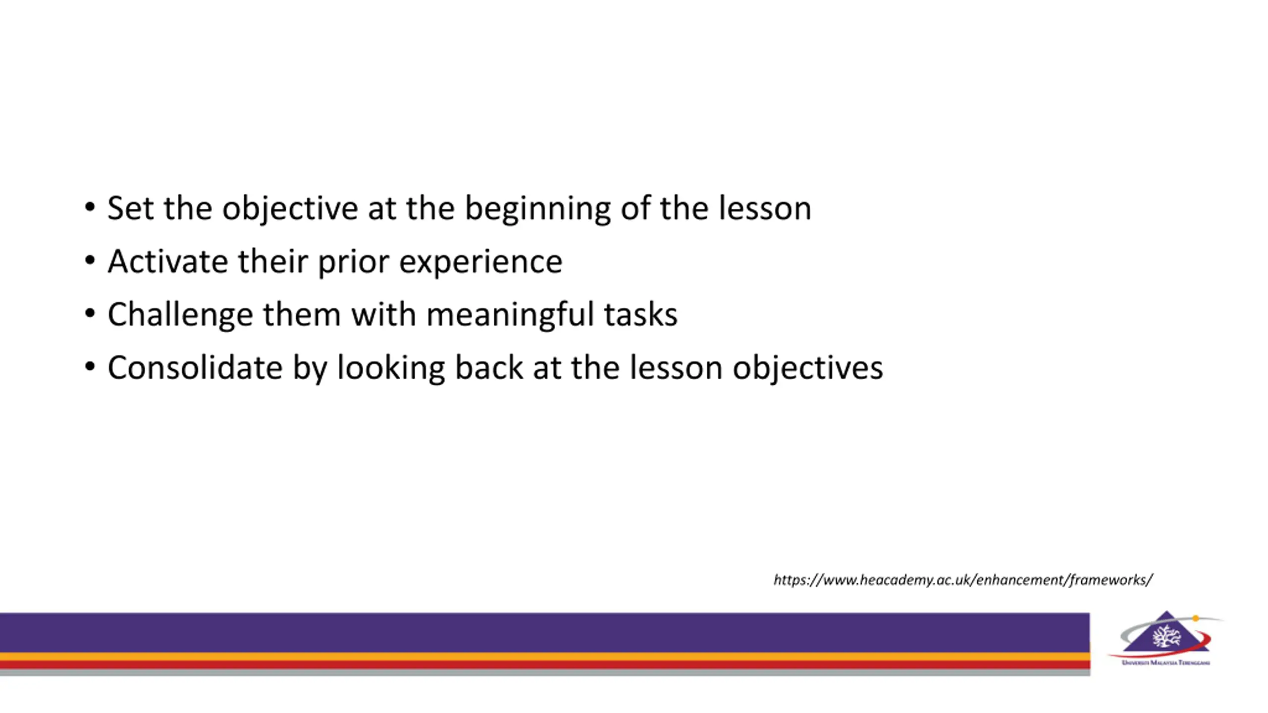 Set the objective at the beginning of the lesson Activate their prior experience Challenge them with meaningful tasks Consolidate by looking back at the lesson objectives https://www.heacademy.ac.uk/enhancement/frameworks/
