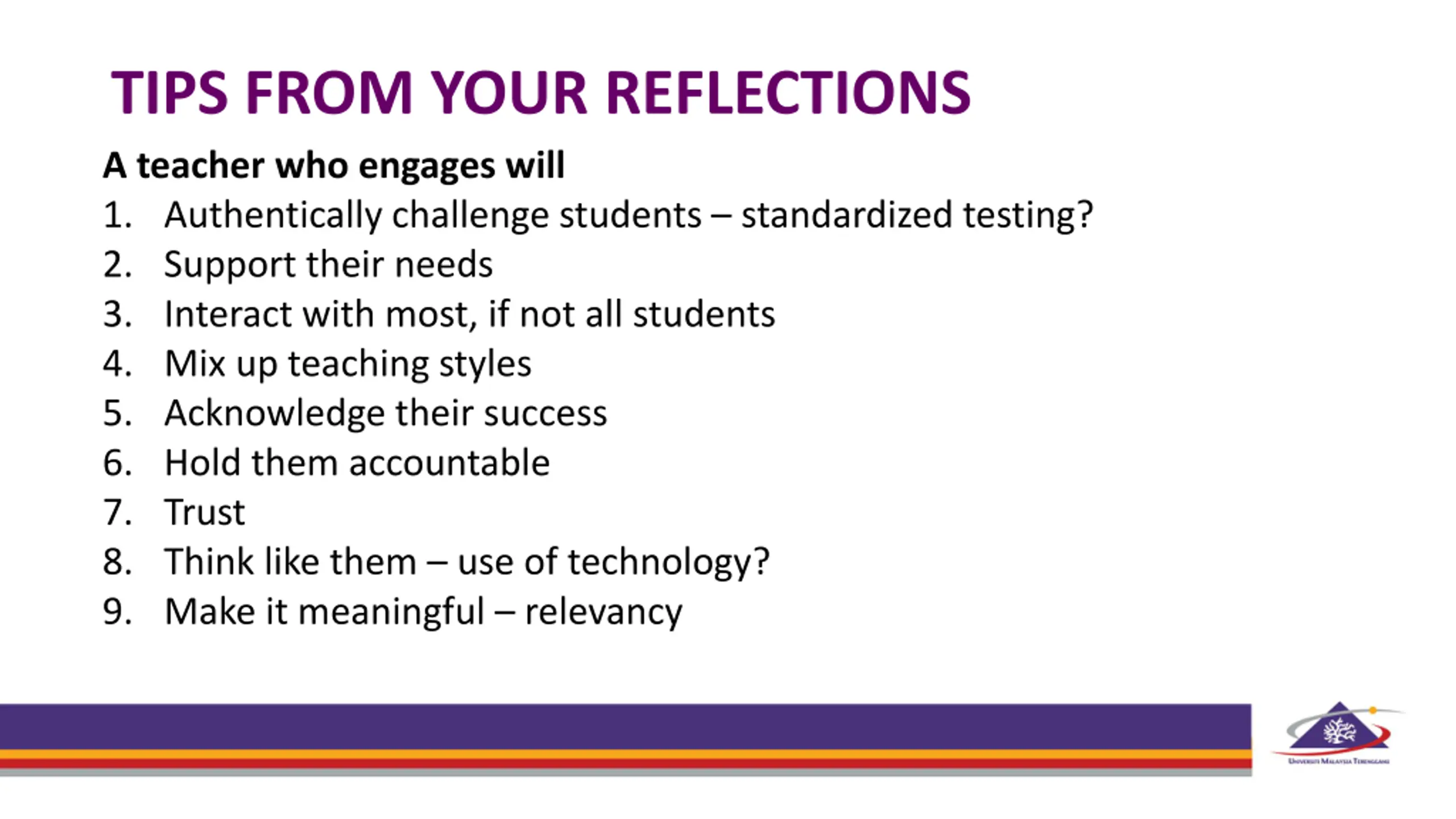 TIPS FROM YOUR REFLECTIONS A teacher who engages will 1. Authentically challenge students standardized testing? 2. Support their needs 3. Interact with most, if not all students 4. Mix up teaching styles 5. Acknowledge their success 6. Hold them accountable 7. Trust 8. Think like them use of technology? 9. Make it meaningful relevancy