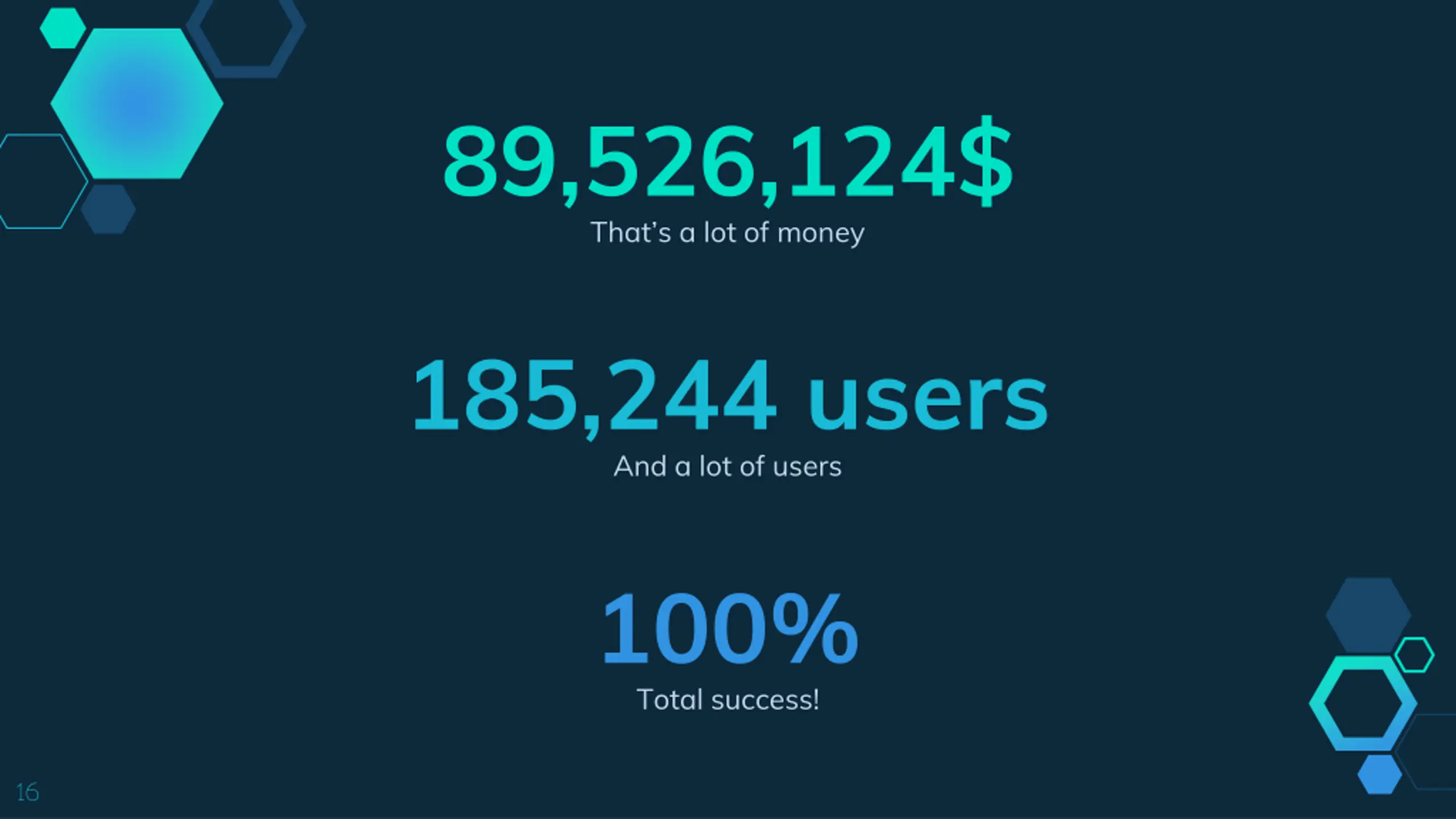 89,526,124$ That s a lot of money 185,244 users And a lot of users 100% Total success! 16