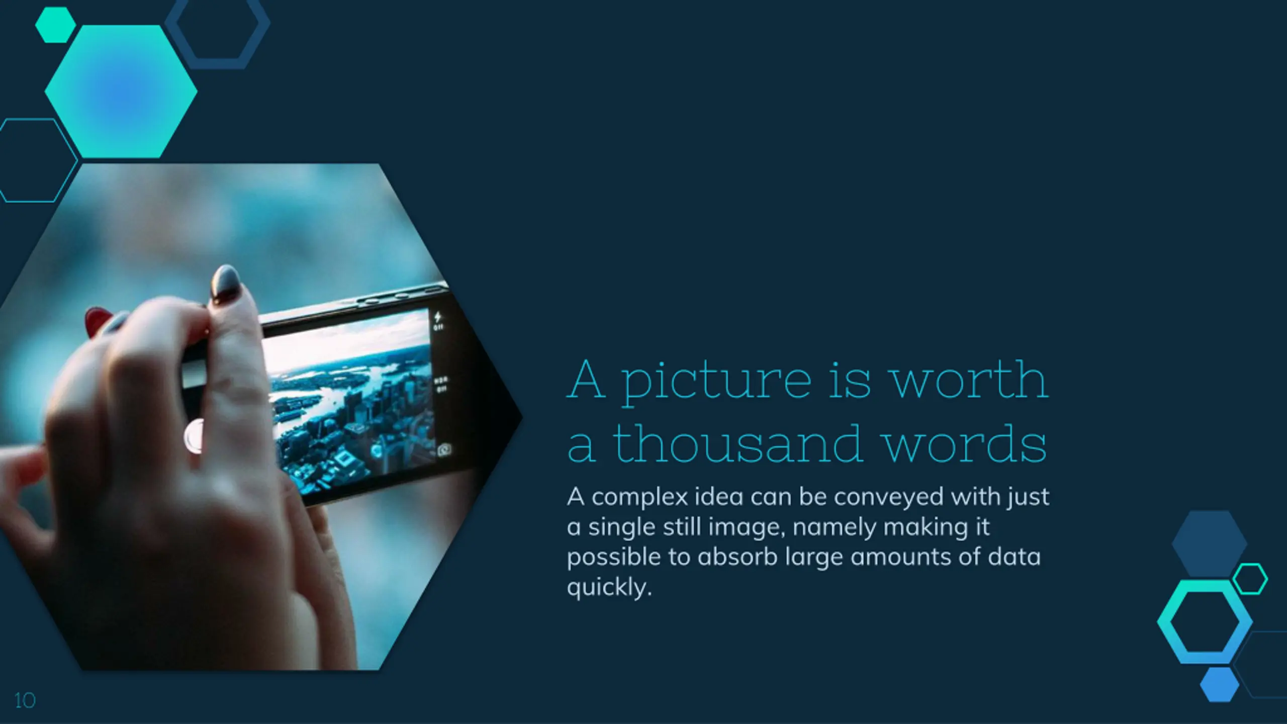 A picture is worth a thousand words A complex idea can be conveyed with just a single still image, namely making it possible to absorb large amounts of data quickly. 10