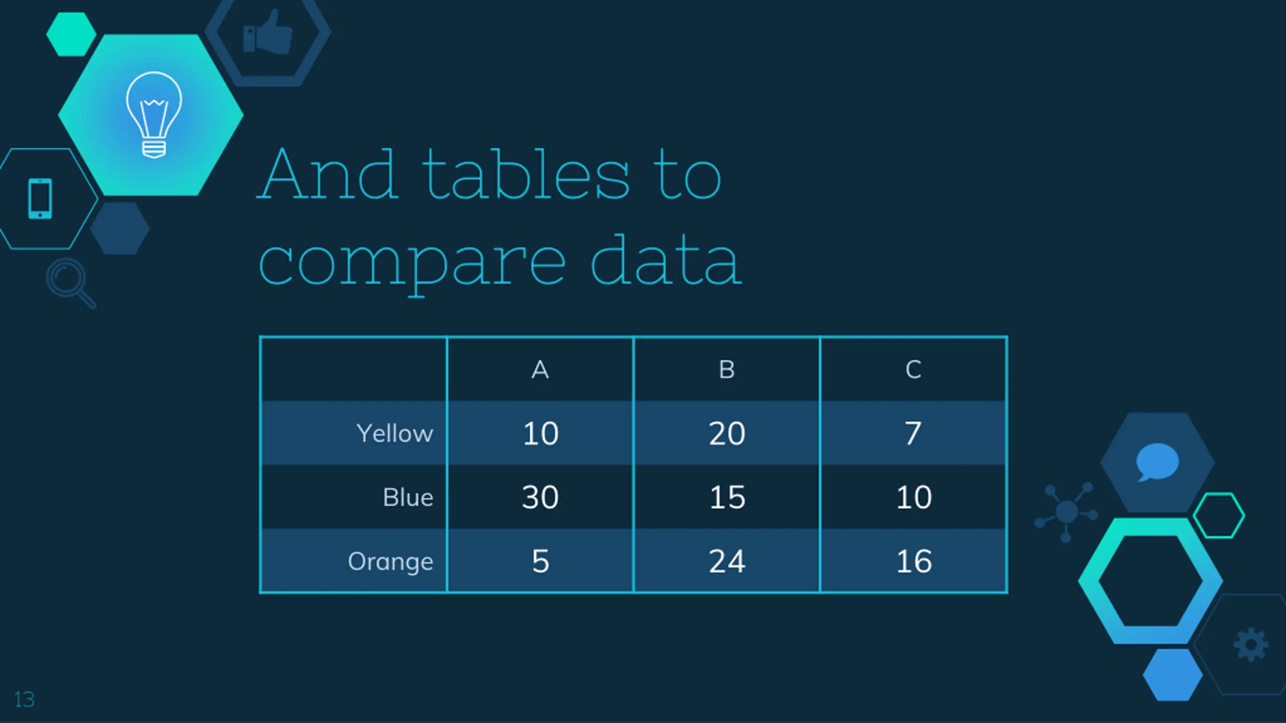 And tables to compare data A B C 10 20 7 Yellow 30 15 10 Blue 5 24 16 Orange 13