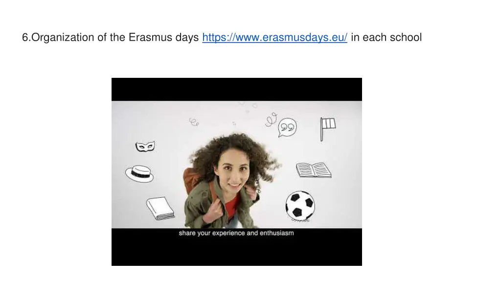 6.Organization of the Erasmus days https://www.erasmusdays.eu/ in each school #ERASMUSDAYS 2020 #ERASMUSDAYS 2020 : SHARE YOUR ERASMUS+ EXPERIENCE Vous tes en Erasmus ou avez d j b n fici du programme ? - Racontez-nous votre exp rience avec #ErasmusDays et identifiez vos meilleures rencontres ! ? You are currently living your Erasmus life abroad or you have been an Erasmus beneficiary a few years ago : don t forget to share your experience by using the #Erasmusdays hashtag on the social networks : Facebook, Twitter, Instagram