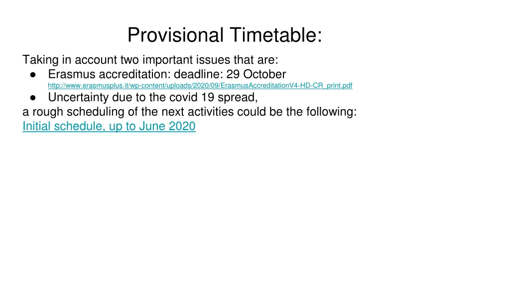 Provisional Timetable: Taking in account two important issues that are: Erasmus accreditation: deadline: 29 October http://www.erasmusplus.it/wp-content/uploads/2020/09/ErasmusAccreditationV4-HD-CR_print.pdf Uncertainty due to the covid 19 spread, a rough scheduling of the next activities could be the following: Initial schedule, up to June 2020