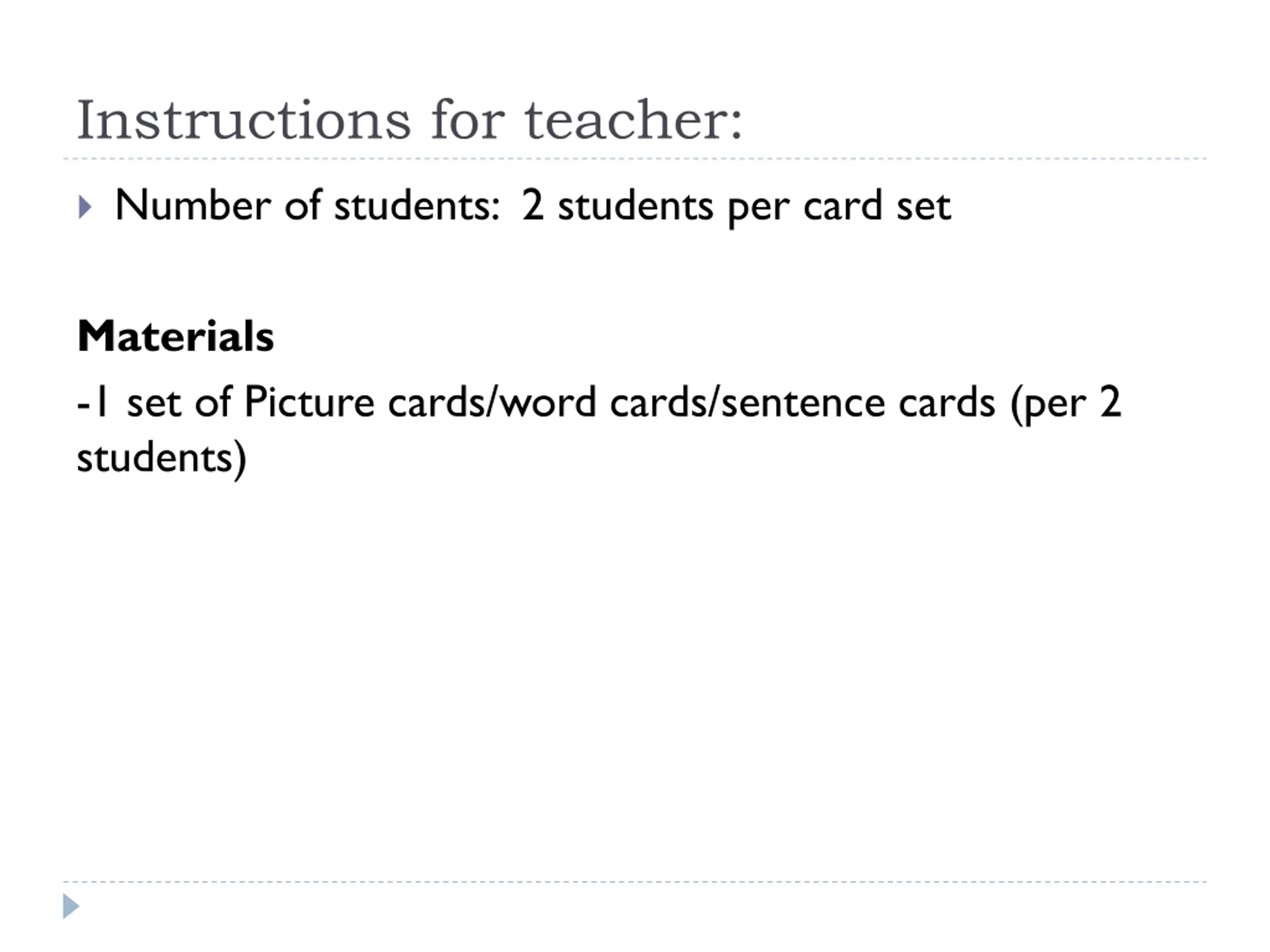 Instructions for teacher: Number of students: 2 students per card set Materials -1 set of Picture cards/word cards/sentence cards (per 2 students)