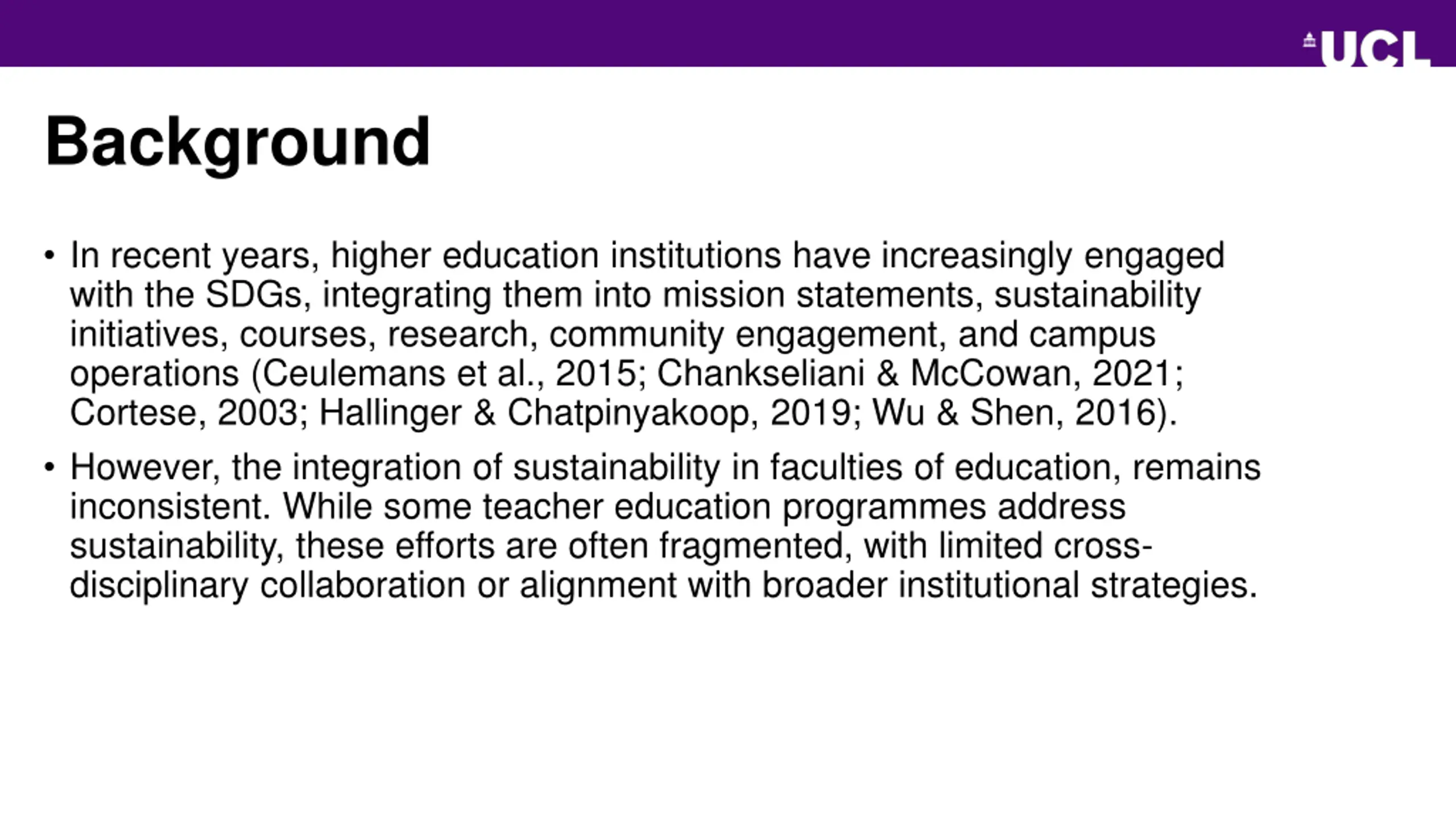 Background In recent years, higher education institutions have increasingly engaged with the SDGs, integrating them into mission statements, sustainability initiatives, courses, research, community engagement, and campus operations (Ceulemans et al., 2015; Chankseliani & McCowan, 2021; Cortese, 2003; Hallinger & Chatpinyakoop, 2019; Wu & Shen, 2016). However, the integration of sustainability in faculties of education, remains inconsistent. While some teacher education programmes address sustainability, these efforts are often fragmented, with limited cross- disciplinary collaboration or alignment with broader institutional strategies.