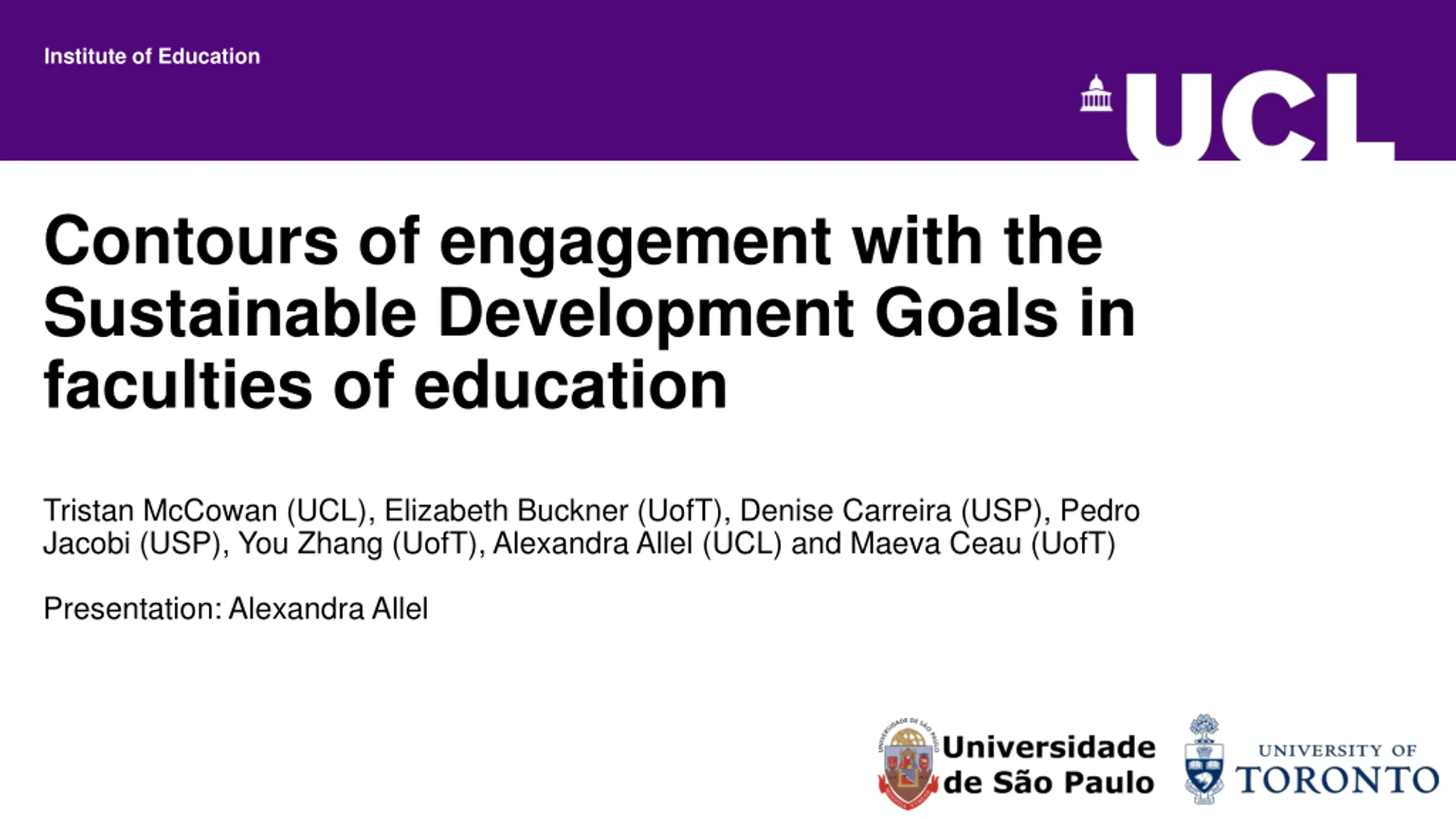 Institute of Education Contours of engagement with the Sustainable Development Goals in faculties of education Tristan McCowan (UCL), Elizabeth Buckner (UofT), Denise Carreira (USP), Pedro Jacobi (USP), You Zhang (UofT), Alexandra Allel (UCL) and Maeva Ceau (UofT) Presentation: Alexandra Allel