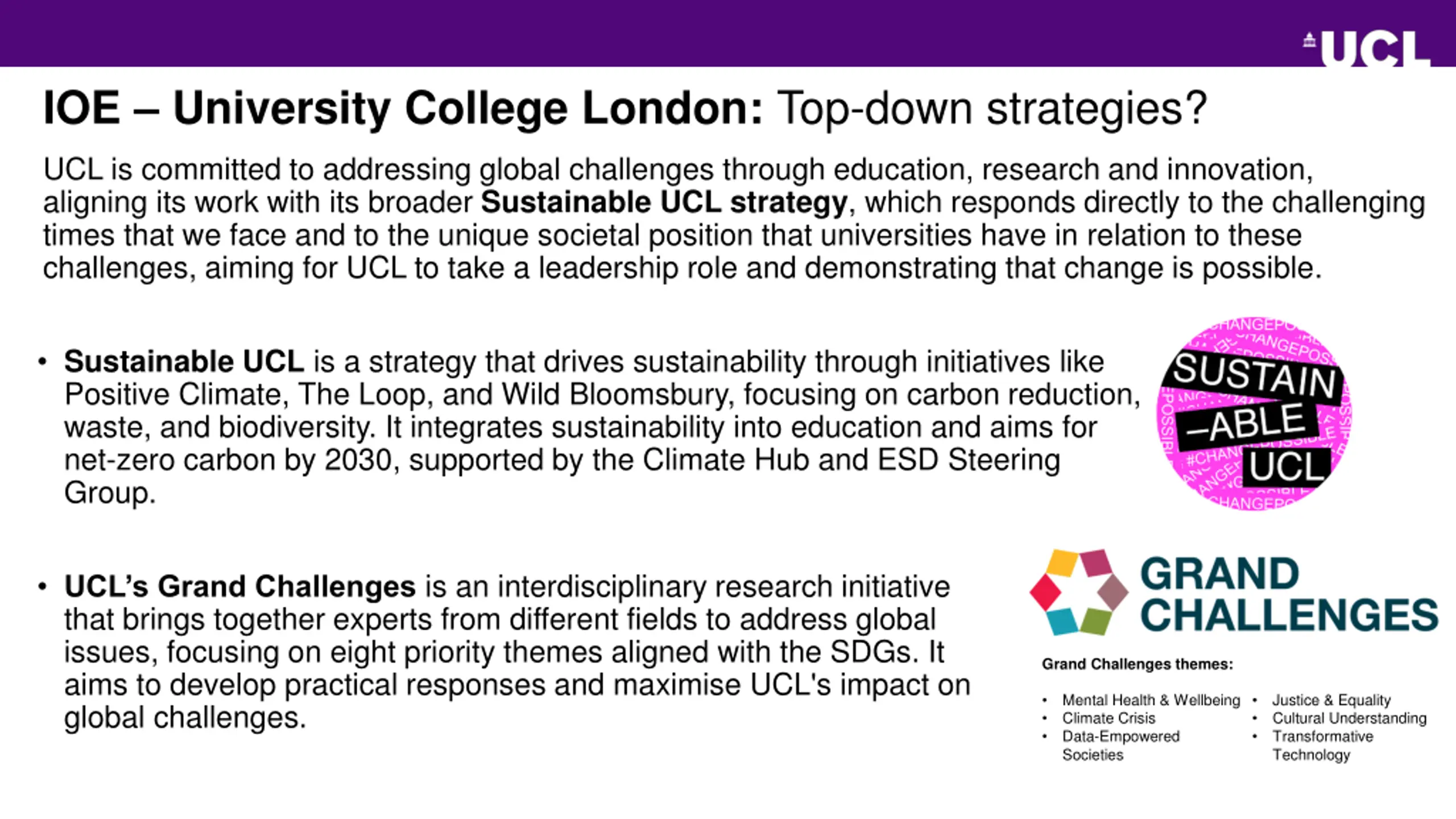 IOE University College London: Top-down strategies? UCL is committed to addressing global challenges through education, research and innovation, aligning its work with its broader Sustainable UCL strategy, which responds directly to the challenging times that we face and to the unique societal position that universities have in relation to these challenges, aiming for UCL to take a leadership role and demonstrating that change is possible. Sustainable UCL is a strategy that drives sustainability through initiatives like Positive Climate, The Loop, and Wild Bloomsbury, focusing on carbon reduction, waste, and biodiversity. It integrates sustainability into education and aims for net-zero carbon by 2030, supported by the Climate Hub and ESD Steering Group. UCL s Grand Challenges is an interdisciplinary research initiative that brings together experts from different fields to address global issues, focusing on eight priority themes aligned with the SDGs. It aims to develop practical responses and maximise UCL's impact on global challenges. Grand Challenges themes: Mental Health & Wellbeing Climate Crisis Data-Empowered Societies Justice & Equality Cultural Understanding Transformative Technology