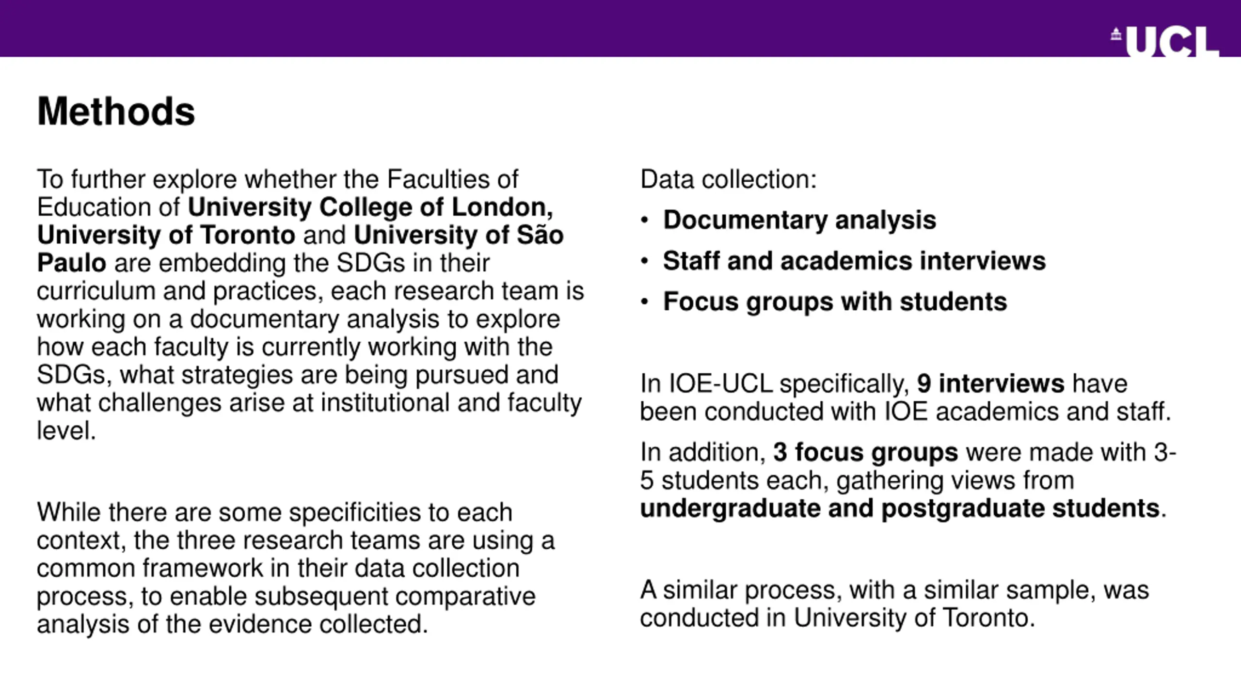 Methods To further explore whether the Faculties of Education of University College of London, University of Toronto and University of S o Paulo are embedding the SDGs in their curriculum and practices, each research team is working on a documentary analysis to explore how each faculty is currently working with the SDGs, what strategies are being pursued and what challenges arise at institutional and faculty level. Data collection: Documentary analysis Staff and academics interviews Focus groups with students In IOE-UCL specifically, 9 interviews have been conducted with IOE academics and staff. In addition, 3 focus groups were made with 3- 5 students each, gathering views from undergraduate and postgraduate students. While there are some specificities to each context, the three research teams are using a common framework in their data collection process, to enable subsequent comparative analysis of the evidence collected. A similar process, with a similar sample, was conducted in University of Toronto.