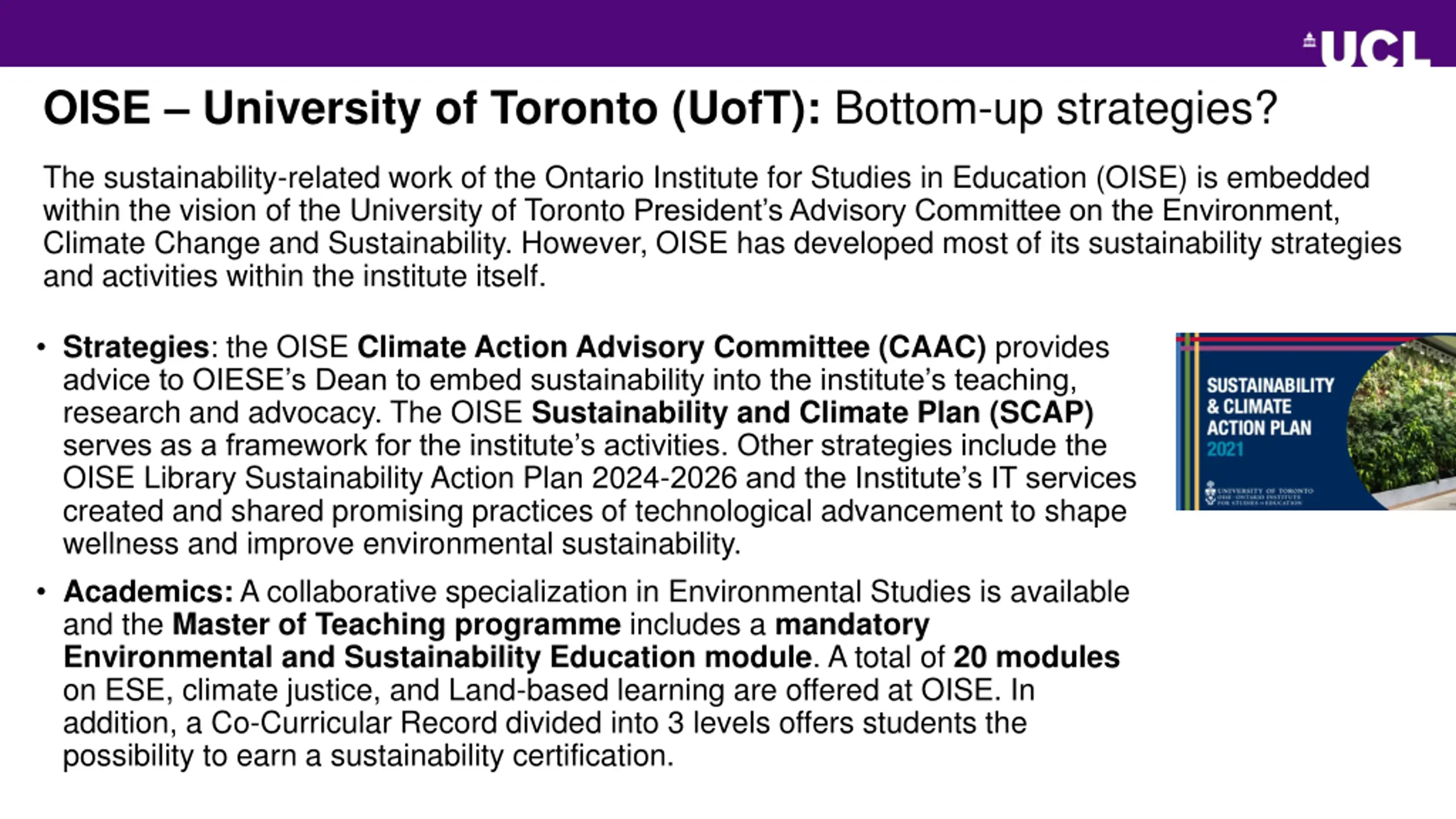 OISE University of Toronto (UofT): Bottom-up strategies? The sustainability-related work of the Ontario Institute for Studies in Education (OISE) is embedded within the vision of the University of Toronto President s Advisory Committee on the Environment, Climate Change and Sustainability. However, OISE has developed most of its sustainability strategies and activities within the institute itself. Strategies: the OISE Climate Action Advisory Committee (CAAC) provides advice to OIESE s Dean to embed sustainability into the institute s teaching, research and advocacy. The OISE Sustainability and Climate Plan (SCAP) serves as a framework for the institute s activities. Other strategies include the OISE Library Sustainability Action Plan 2024-2026 and the Institute s IT services created and shared promising practices of technological advancement to shape wellness and improve environmental sustainability. Academics: A collaborative specialization in Environmental Studies is available and the Master of Teaching programme includes a mandatory Environmental and Sustainability Education module. A total of 20 modules on ESE, climate justice, and Land-based learning are offered at OISE. In addition, a Co-Curricular Record divided into 3 levels offers students the possibility to earn a sustainability certification.