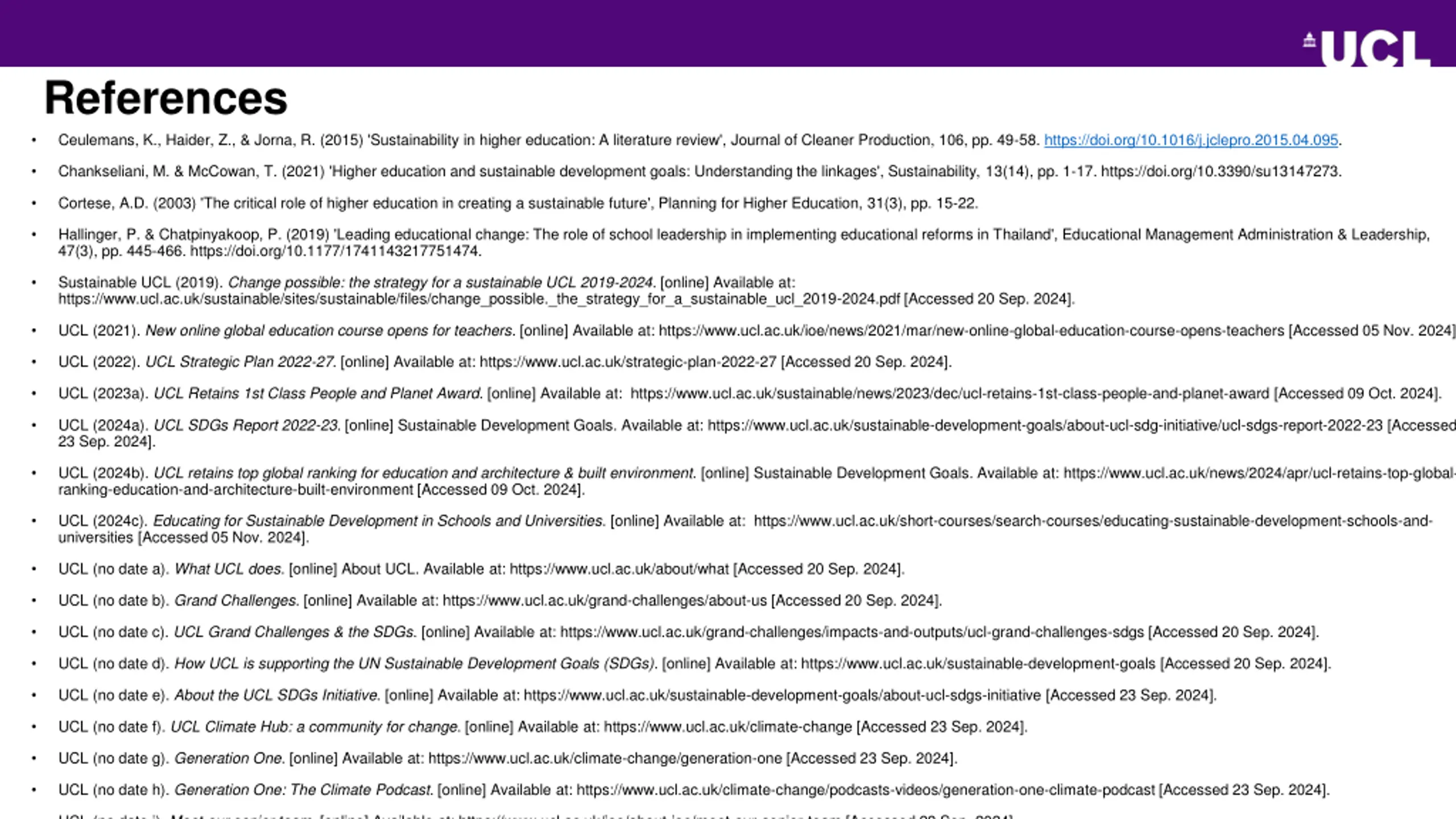 References Ceulemans, K., Haider, Z., & Jorna, R. (2015) 'Sustainability in higher education: A literature review', Journal of Cleaner Production, 106, pp. 49-58. https://doi.org/10.1016/j.jclepro.2015.04.095. https://doi.org/10.1016/j.jclepro.2015.04.095 Chankseliani, M. & McCowan, T. (2021) 'Higher education and sustainable development goals: Understanding the linkages', Sustainability, 13(14), pp. 1-17. https://doi.org/10.3390/su13147273. Cortese, A.D. (2003) 'The critical role of higher education in creating a sustainable future', Planning for Higher Education, 31(3), pp. 15-22. Hallinger, P. & Chatpinyakoop, P. (2019) 'Leading educational change: The role of school leadership in implementing educational reforms in Thailand', Educational Management Administration & Leadership, 47(3), pp. 445-466. https://doi.org/10.1177/1741143217751474. Sustainable UCL (2019). Change possible: the strategy for a sustainable UCL 2019-2024. [online] Available at: https://www.ucl.ac.uk/sustainable/sites/sustainable/files/change_possible._the_strategy_for_a_sustainable_ucl_2019-2024.pdf [Accessed 20 Sep. 2024]. UCL (2021). New online global education course opens for teachers. [online] Available at: https://www.ucl.ac.uk/ioe/news/2021/mar/new-online-global-education-course-opens-teachers [Accessed 05 Nov. 2024]. UCL (2022). UCL Strategic Plan 2022-27. [online] Available at: https://www.ucl.ac.uk/strategic-plan-2022-27 [Accessed 20 Sep. 2024]. UCL (2023a). UCL Retains 1st Class People and Planet Award. [online] Available at: https://www.ucl.ac.uk/sustainable/news/2023/dec/ucl-retains-1st-class-people-and-planet-award [Accessed 09 Oct. 2024]. UCL (2024a). UCL SDGs Report 2022-23. [online] Sustainable Development Goals. Available at: https://www.ucl.ac.uk/sustainable-development-goals/about-ucl-sdg-initiative/ucl-sdgs-report-2022-23 [Accessed 23 Sep. 2024]. UCL (2024b). UCL retains top global ranking for education and architecture & built environment. [online] Sustainable Development Goals. Available at: https://www.ucl.ac.uk/news/2024/apr/ucl-retains-top-global- ranking-education-and-architecture-built-environment [Accessed 09 Oct. 2024]. UCL (2024c). Educating for Sustainable Development in Schools and Universities. [online] Available at: https://www.ucl.ac.uk/short-courses/search-courses/educating-sustainable-development-schools-and- universities [Accessed 05 Nov. 2024]. UCL (no date a). What UCL does. [online] About UCL. Available at: https://www.ucl.ac.uk/about/what [Accessed 20 Sep. 2024]. UCL (no date b). Grand Challenges. [online] Available at: https://www.ucl.ac.uk/grand-challenges/about-us [Accessed 20 Sep. 2024]. UCL (no date c). UCL Grand Challenges & the SDGs. [online] Available at: https://www.ucl.ac.uk/grand-challenges/impacts-and-outputs/ucl-grand-challenges-sdgs [Accessed 20 Sep. 2024]. UCL (no date d). How UCL is supporting the UN Sustainable Development Goals (SDGs). [online] Available at: https://www.ucl.ac.uk/sustainable-development-goals [Accessed 20 Sep. 2024]. UCL (no date e). About the UCL SDGs Initiative. [online] Available at: https://www.ucl.ac.uk/sustainable-development-goals/about-ucl-sdgs-initiative [Accessed 23 Sep. 2024]. UCL (no date f). UCL Climate Hub: a community for change. [online] Available at: https://www.ucl.ac.uk/climate-change [Accessed 23 Sep. 2024]. UCL (no date g). Generation One. [online] Available at: https://www.ucl.ac.uk/climate-change/generation-one [Accessed 23 Sep. 2024]. UCL (no date h). Generation One: The Climate Podcast. [online] Available at: https://www.ucl.ac.uk/climate-change/podcasts-videos/generation-one-climate-podcast [Accessed 23 Sep. 2024]. UCL (no date i). Meet our senior team. [online] Available at: https://www.ucl.ac.uk/ioe/about ioe/meet our senior team [Accessed 23 Sep. 2024].