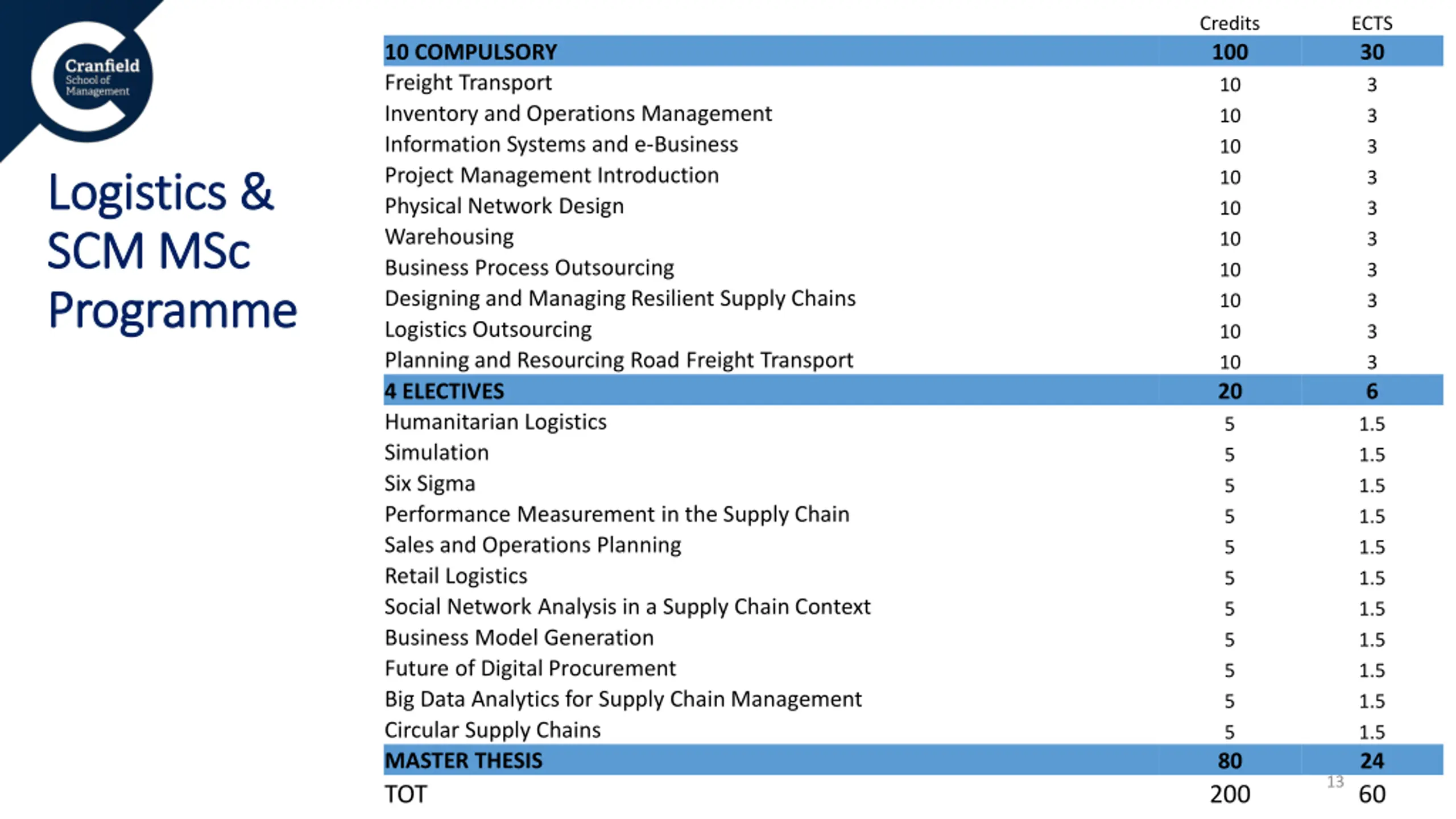 Structure Structure First year at PoliBa (60 ECTS) Second year at Cranfield School of Management (60 ECTS) Management MSc https://www.cranfield.ac.uk/som/masters-courses/management Logistics and Supply Chain Management MSc https://www.cranfield.ac.uk/som/masters-courses/logistics-and-supply-chain-management# Procurement and Supply Chain Management MSc https://www.cranfield.ac.uk/som/masters-courses/procurement-and-supply-chain-management 10