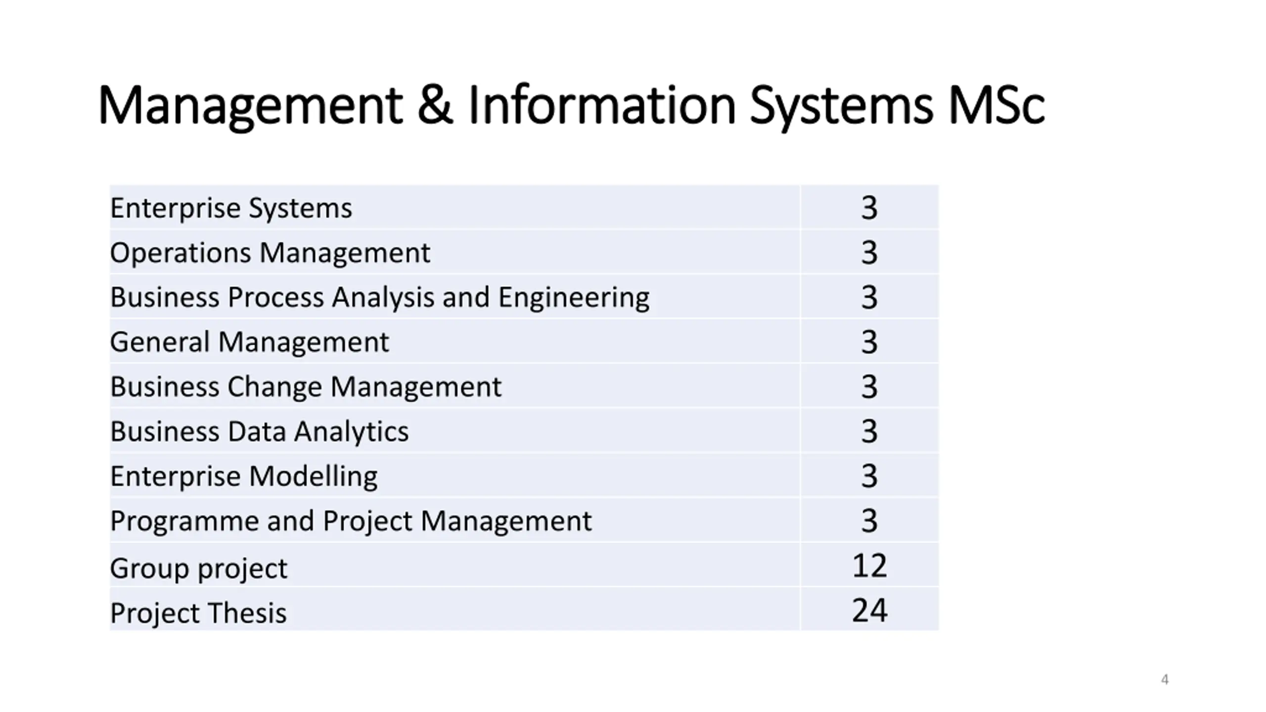 Management & Information Systems Management & Information Systems MSc MSc 3 3 3 3 3 3 3 3 12 24 Enterprise Systems Operations Management Business Process Analysis and Engineering General Management Business Change Management Business Data Analytics Enterprise Modelling Programme and Project Management Group project Project Thesis 4