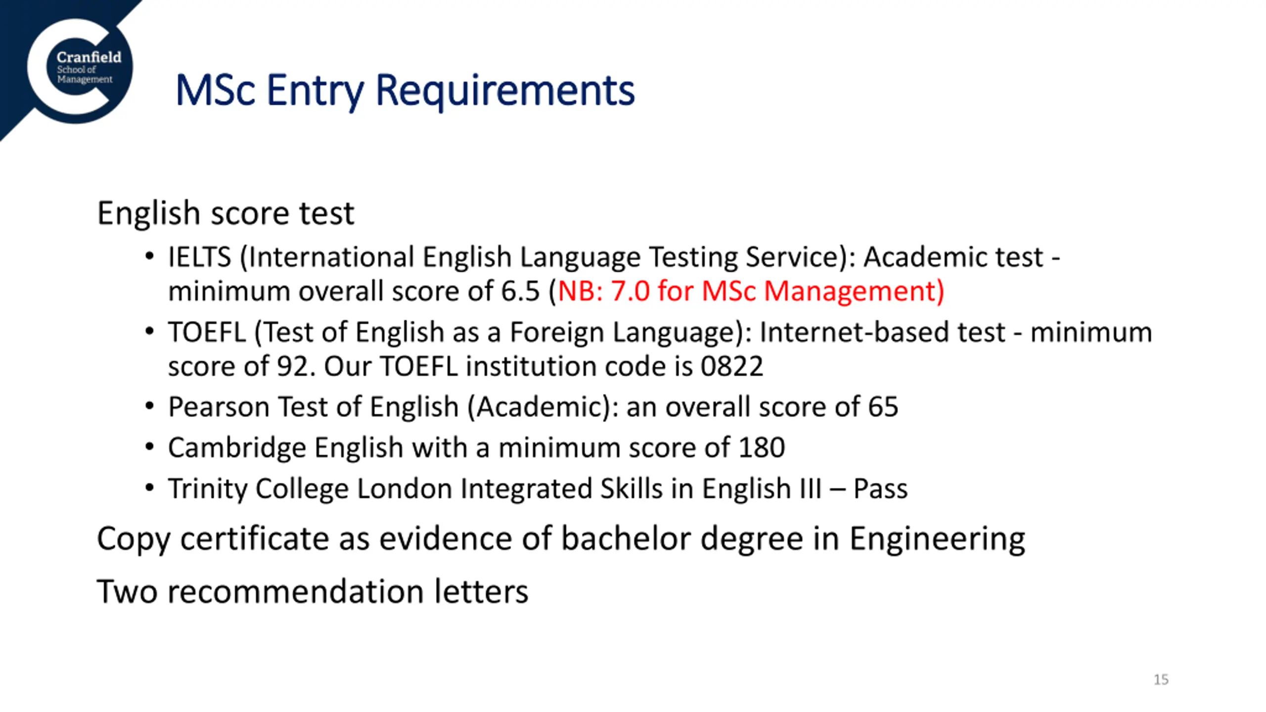 MSc Entry Requirements MSc Entry Requirements English score test IELTS (International English Language Testing Service): Academic test - minimum overall score of 6.5 (NB: 7.0 for MSc Management) TOEFL (Test of English as a Foreign Language): Internet-based test - minimum score of 92. Our TOEFL institution code is 0822 Pearson Test of English (Academic): an overall score of 65 Cambridge English with a minimum score of 180 Trinity College London Integrated Skills in English III Pass Copy certificate as evidence of bachelor degree in Engineering Two recommendation letters 15