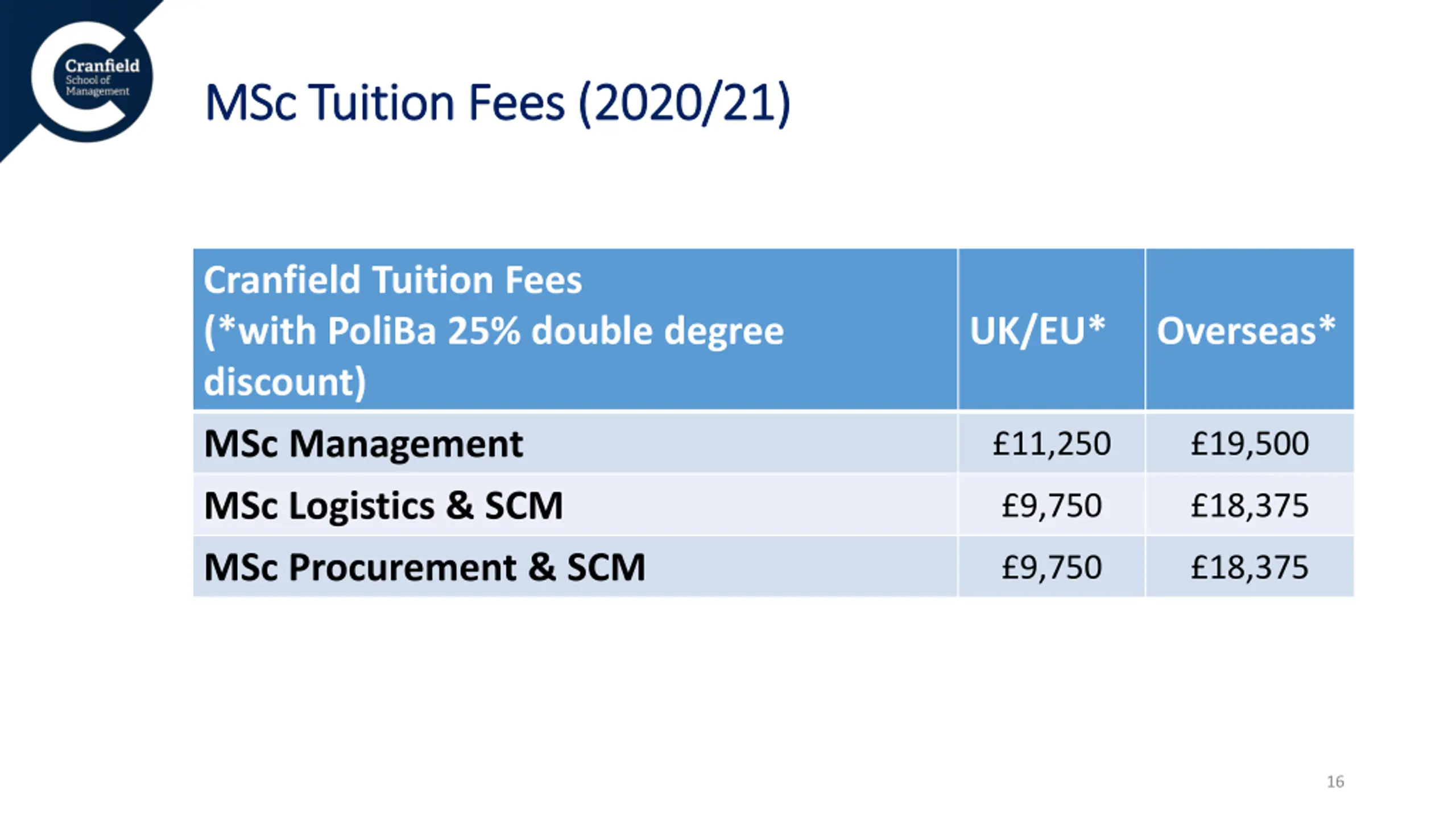 MSc Tuition Fees (2020/21) MSc Tuition Fees (2020/21) Cranfield Tuition Fees (*with PoliBa 25% double degree discount) MSc Management MSc Logistics & SCM MSc Procurement & SCM UK/EU* Overseas* 11,250 19,500 9,750 18,375 9,750 18,375 16