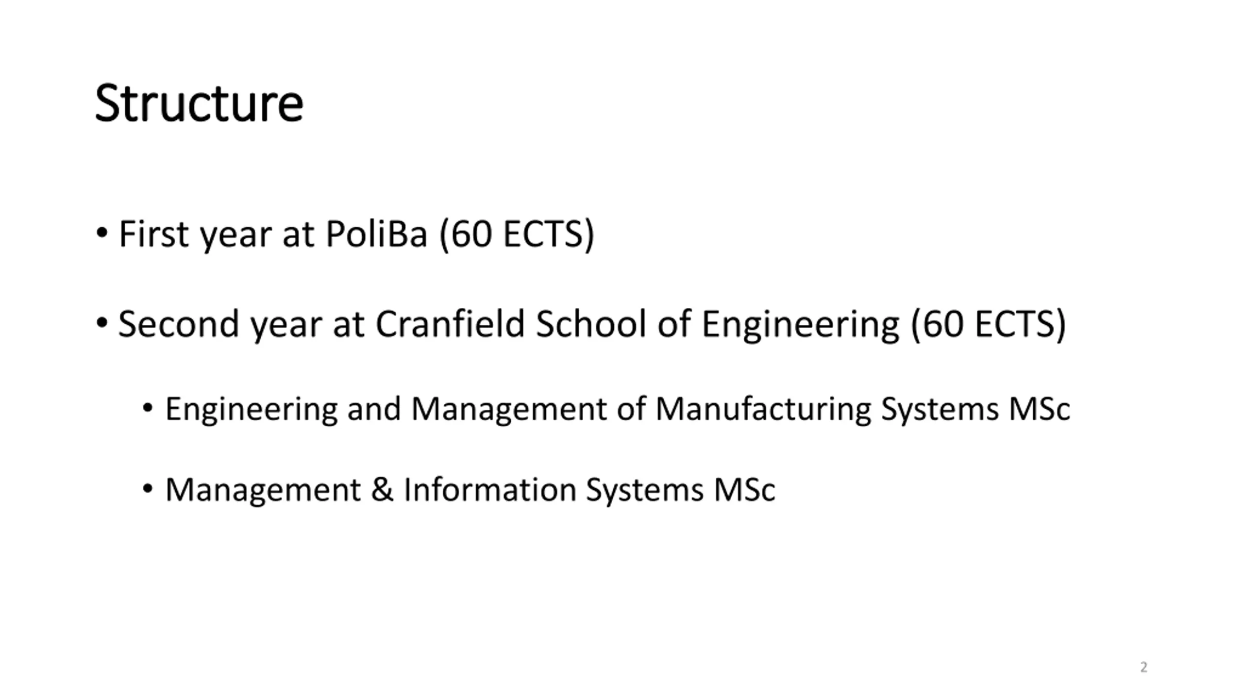 Structure Structure First year at PoliBa (60 ECTS) Second year at Cranfield School of Engineering (60 ECTS) Engineering and Management of Manufacturing Systems MSc Management & Information Systems MSc 2