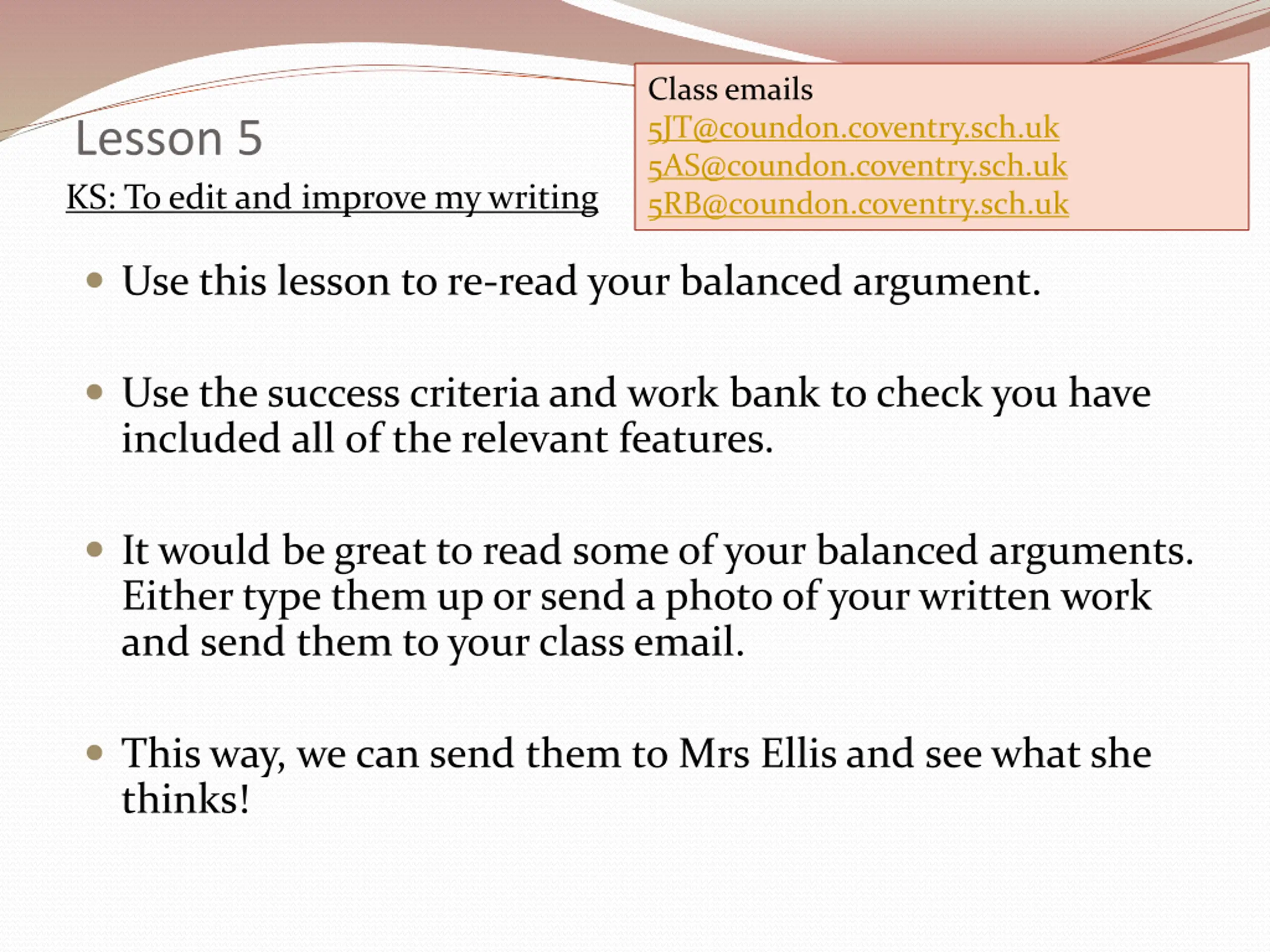 Class emails 5JT@coundon.coventry.sch.uk 5AS@coundon.coventry.sch.uk 5RB@coundon.coventry.sch.uk Lesson 5 KS: To edit and improve my writing Use this lesson to re-read your balanced argument. Use the success criteria and work bank to check you have included all of the relevant features. It would be great to read some of your balanced arguments. Either type them up or send a photo of your written work and send them to your class email. This way, we can send them to Mrs Ellis and see what she thinks!