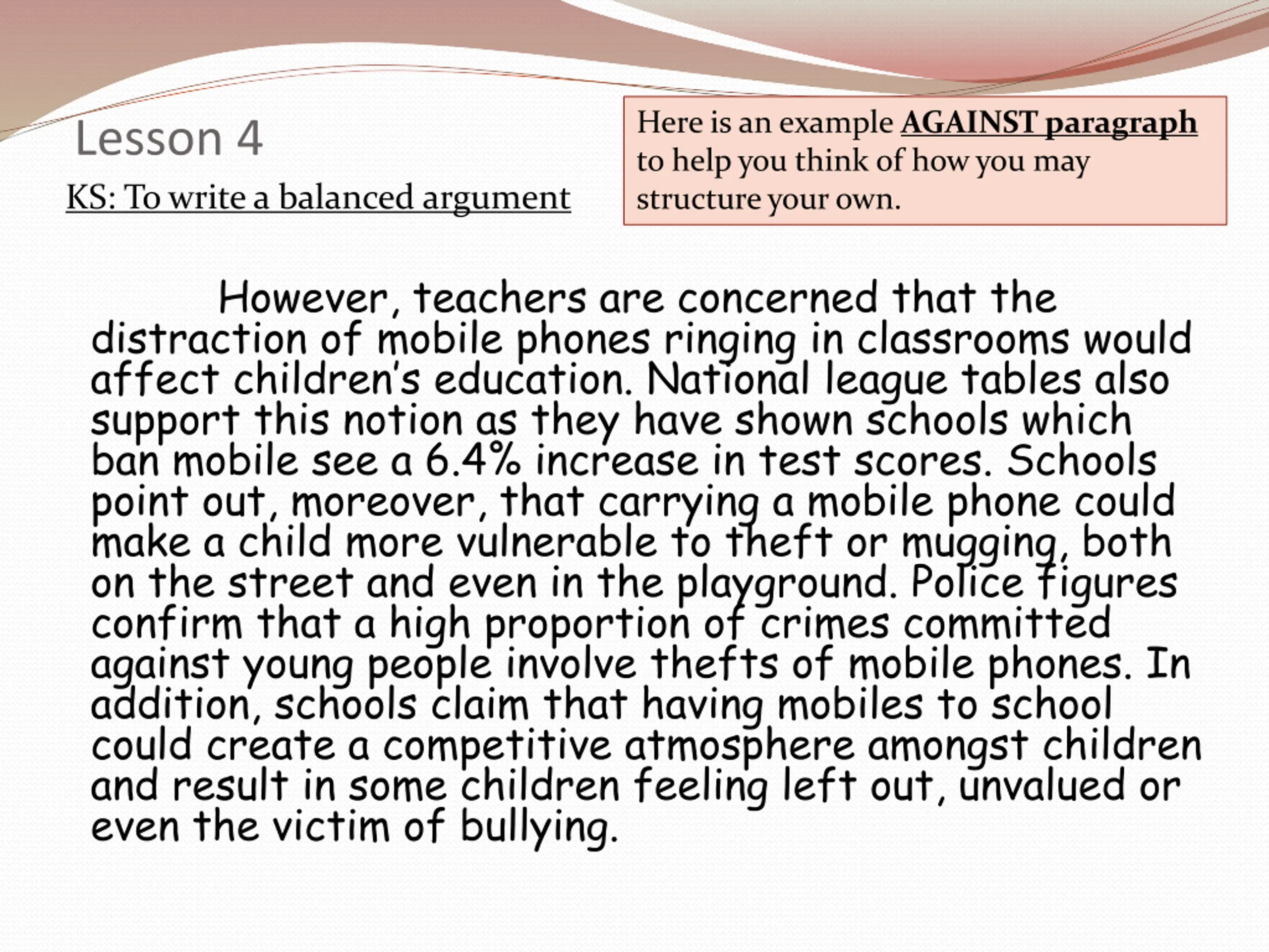 Here is an example AGAINST paragraph to help you think of how you may structure your own. Lesson 4 KS: To write a balanced argument However, teachers are concerned that the distraction of mobile phones ringing in classrooms would affect children s education. National league tables also support this notion as they have shown schools which ban mobile see a 6.4% increase in test scores. Schools point out, moreover, that carrying a mobile phone could make a child more vulnerable to theft or mugging, both on the street and even in the playground. Police figures confirm that a high proportion of crimes committed against young people involve thefts of mobile phones. In addition, schools claim that having mobiles to school could create a competitive atmosphere amongst children and result in some children feeling left out, unvalued or even the victim of bullying.