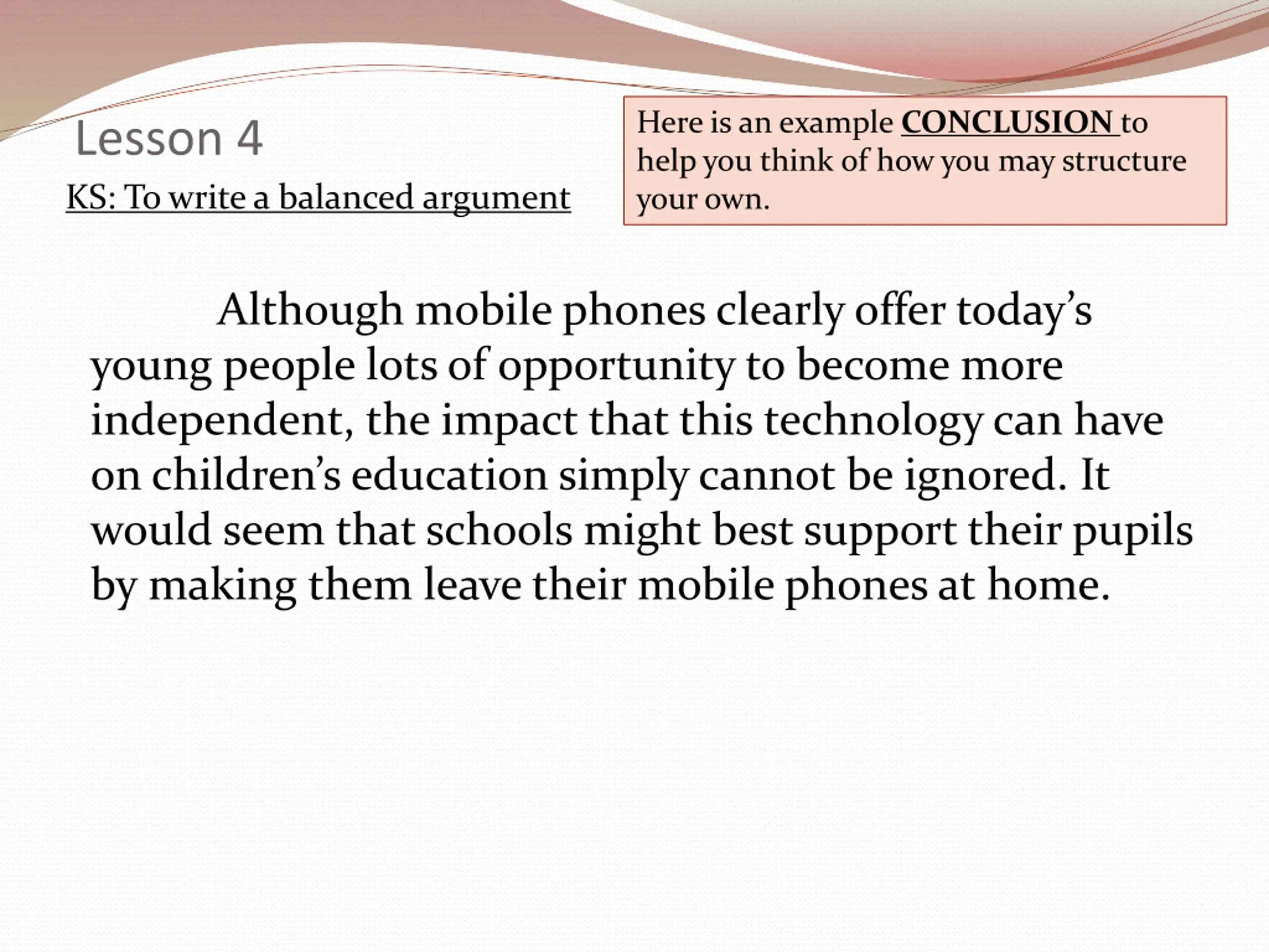 Here is an example CONCLUSION to help you think of how you may structure your own. Lesson 4 KS: To write a balanced argument Although mobile phones clearly offer today s young people lots of opportunity to become more independent, the impact that this technology can have on children s education simply cannot be ignored. It would seem that schools might best support their pupils by making them leave their mobile phones at home.