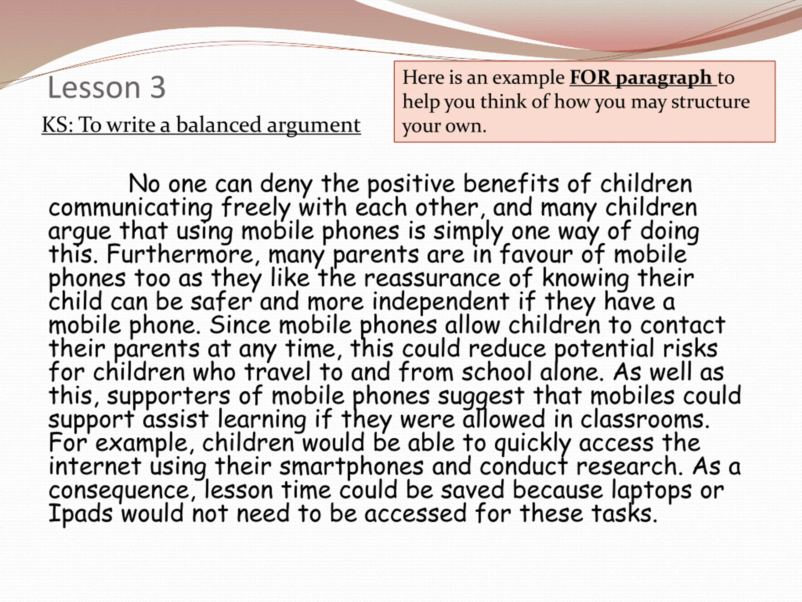 Here is an example FOR paragraph to help you think of how you may structure your own. Lesson 3 KS: To write a balanced argument No one can deny the positive benefits of children communicating freely with each other, and many children argue that using mobile phones is simply one way of doing this. Furthermore, many parents are in favour of mobile phones too as they like the reassurance of knowing their child can be safer and more independent if they have a mobile phone. Since mobile phones allow children to contact their parents at any time, this could reduce potential risks for children who travel to and from school alone. As well as this, supporters of mobile phones suggest that mobiles could support assist learning if they were allowed in classrooms. For example, children would be able to quickly access the internet using their smartphones and conduct research. As a consequence, lesson time could be saved because laptops or Ipads would not need to be accessed for these tasks.