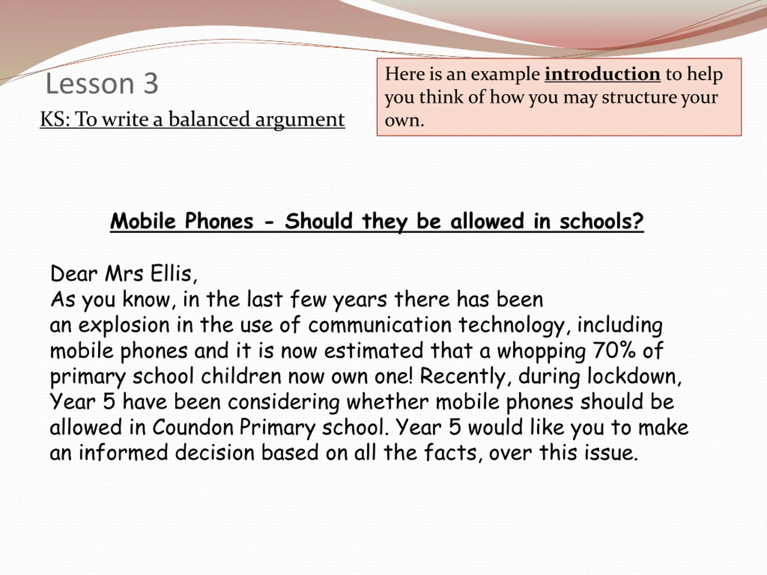 Here is an example introduction to help you think of how you may structure your own. Lesson 3 KS: To write a balanced argument Mobile Phones - Should they be allowed in schools? Dear Mrs Ellis, As you know, in the last few years there has been an explosion in the use of communication technology, including mobile phones and it is now estimated that a whopping 70% of primary school children now own one! Recently, during lockdown, Year 5 have been considering whether mobile phones should be allowed in Coundon Primary school. Year 5 would like you to make an informed decision based on all the facts, over this issue.