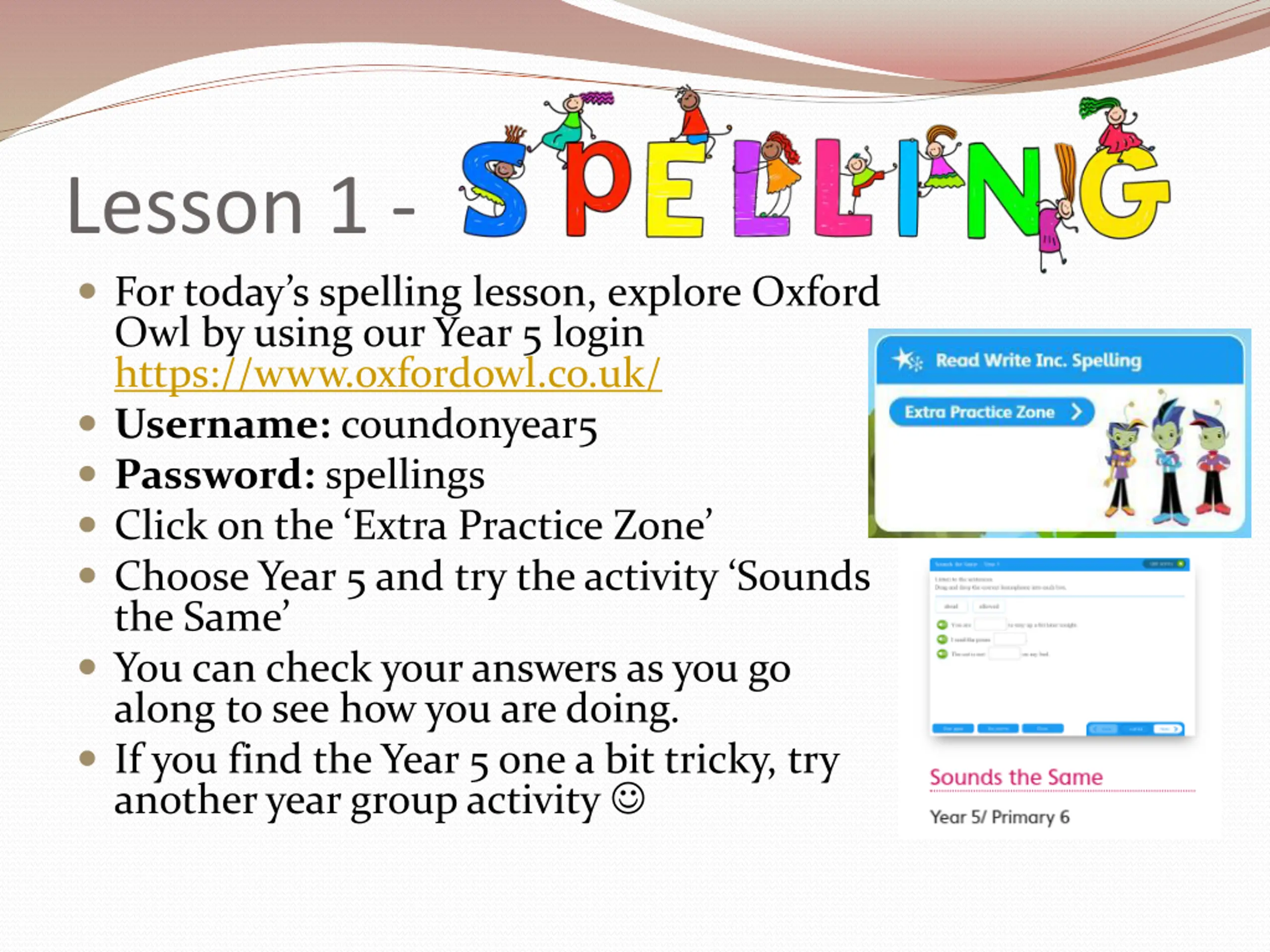 Lesson 1 - For today s spelling lesson, explore Oxford Owl by using our Year 5 login https://www.oxfordowl.co.uk/ Username: coundonyear5 Password: spellings Click on the Extra Practice Zone Choose Year 5 and try the activity Sounds the Same You can check your answers as you go along to see how you are doing. If you find the Year 5 one a bit tricky, try another year group activity