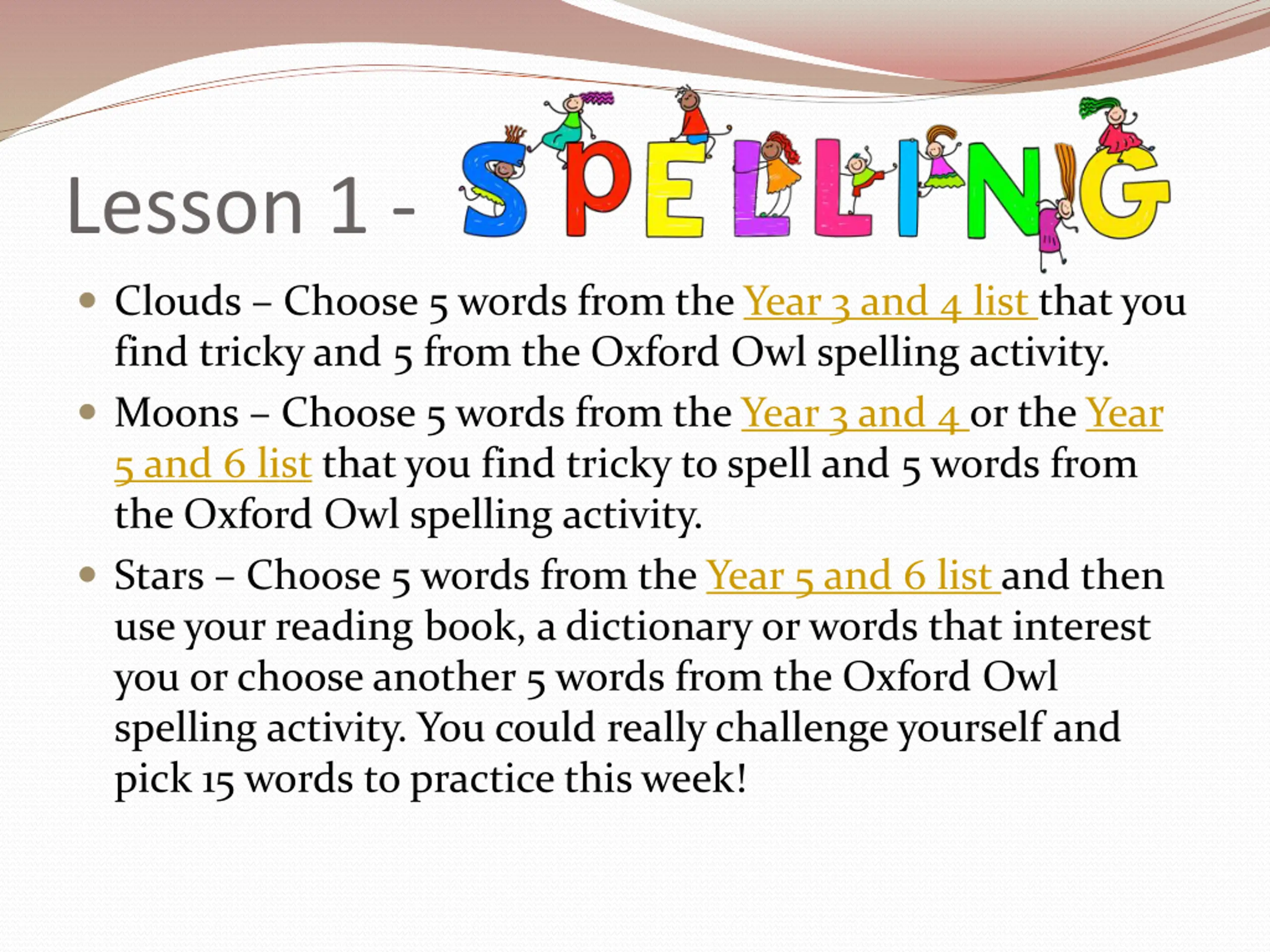 Lesson 1 - Clouds Choose 5 words from the Year 3 and 4 list that you find tricky and 5 from the Oxford Owl spelling activity. Moons Choose 5 words from the Year 3 and 4 or the Year 5 and 6 list that you find tricky to spell and 5 words from the Oxford Owl spelling activity. Stars Choose 5 words from the Year 5 and 6 list and then use your reading book, a dictionary or words that interest you or choose another 5 words from the Oxford Owl spelling activity. You could really challenge yourself and pick 15 words to practice this week!